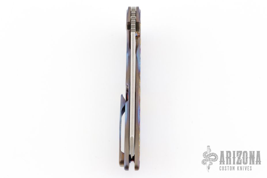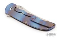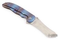 This Norseman (#283) by John Grimsmo features a tumbled blade with a single anodized titanium thumb stud, notched thumb ramp and flipper. Stonewashed and anodized titanium frame with a honeycomb pattern front scale and titanium screws. Matching tip up pocket clip.  Very smooth action that requires no wrist movement. Nice detent, lockup and blade seating. Rides on ceramic bearings. Comes with COA.  Excellent Condition.