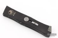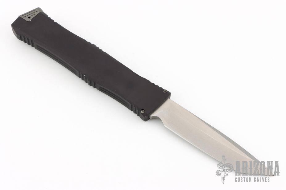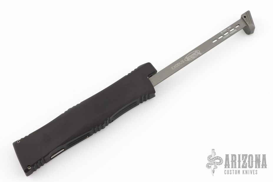 This Exodus by Microtech opens out the front via the automatic push button. Closes by disengaging the leaf lock and pulling the reverse charging handle in the rear of the frame. Contoured frame grip with milled ribbing on the frame spine and belly. This Exodus features a stonewash finished tanto blade. Dated 08/2001. Has a couple very light scuffs, otherwise excellent condition.  Comes with original box, sheath and papers.