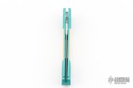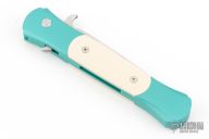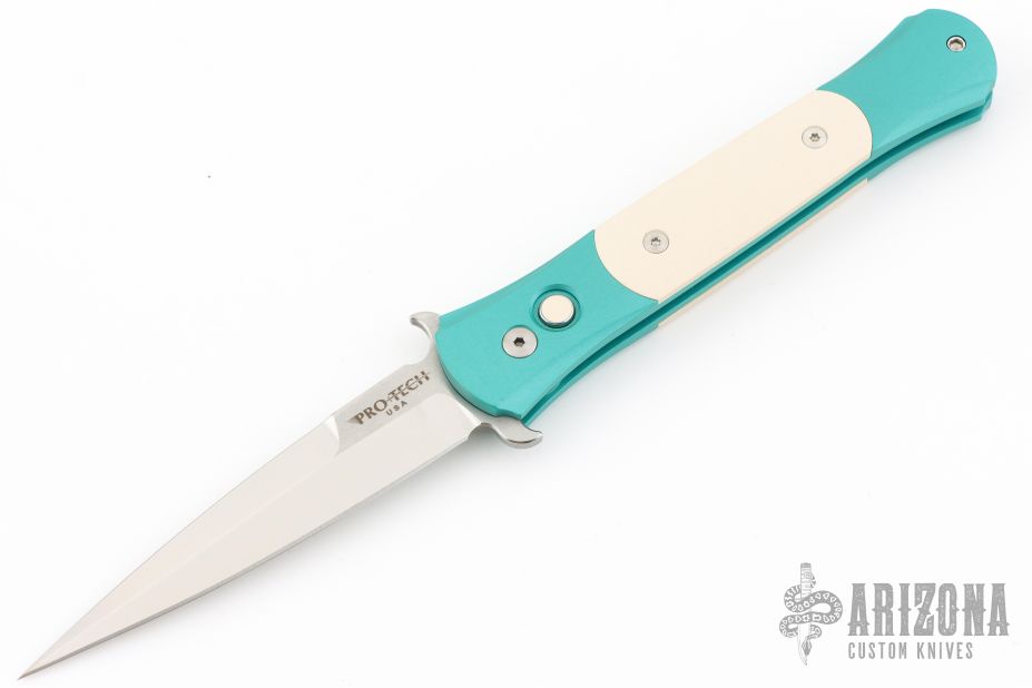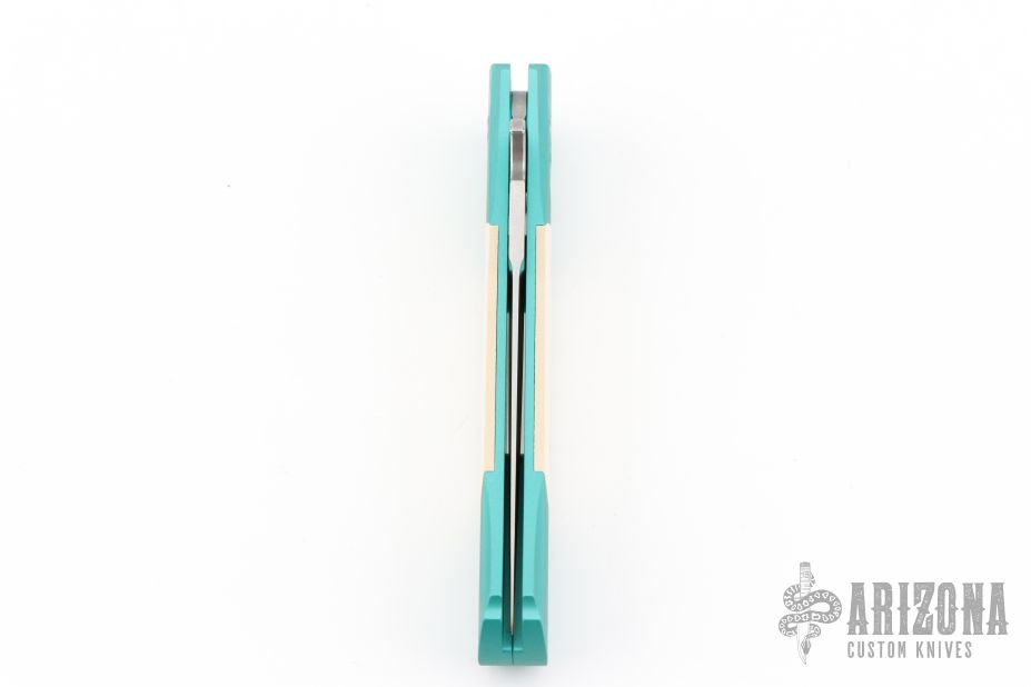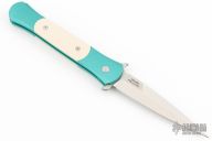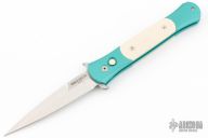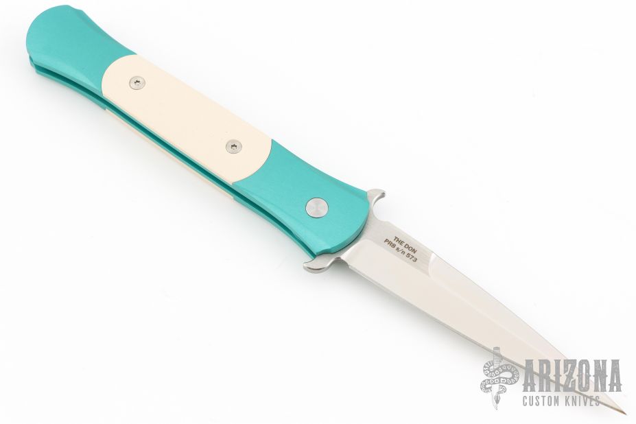 This Don features a satin finish blade, teal aluminum handle, and polished ivory paper micarta inlays. Excellent/new condition with original box and papers. "PR8 #573" on blade.