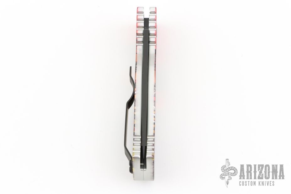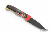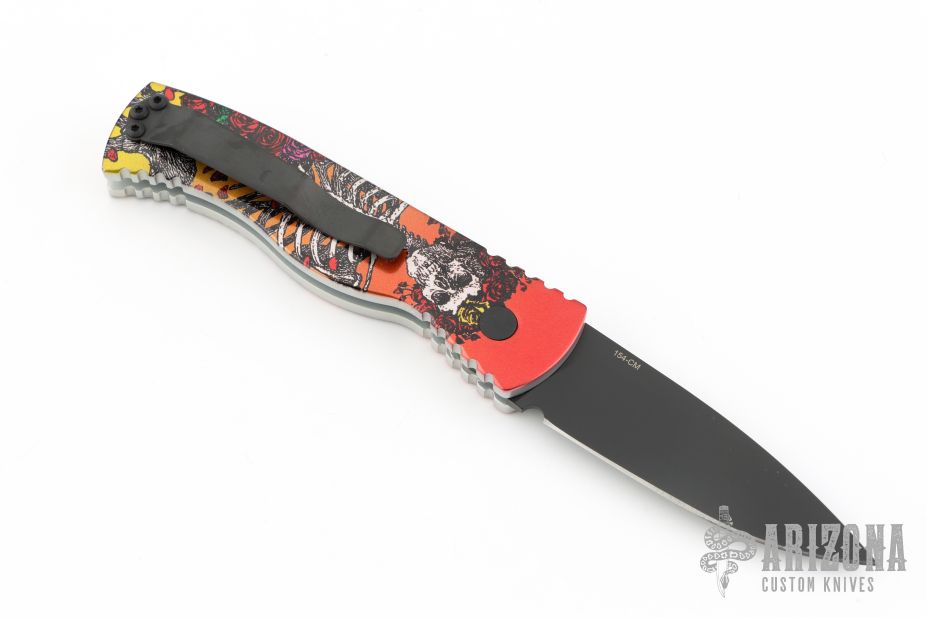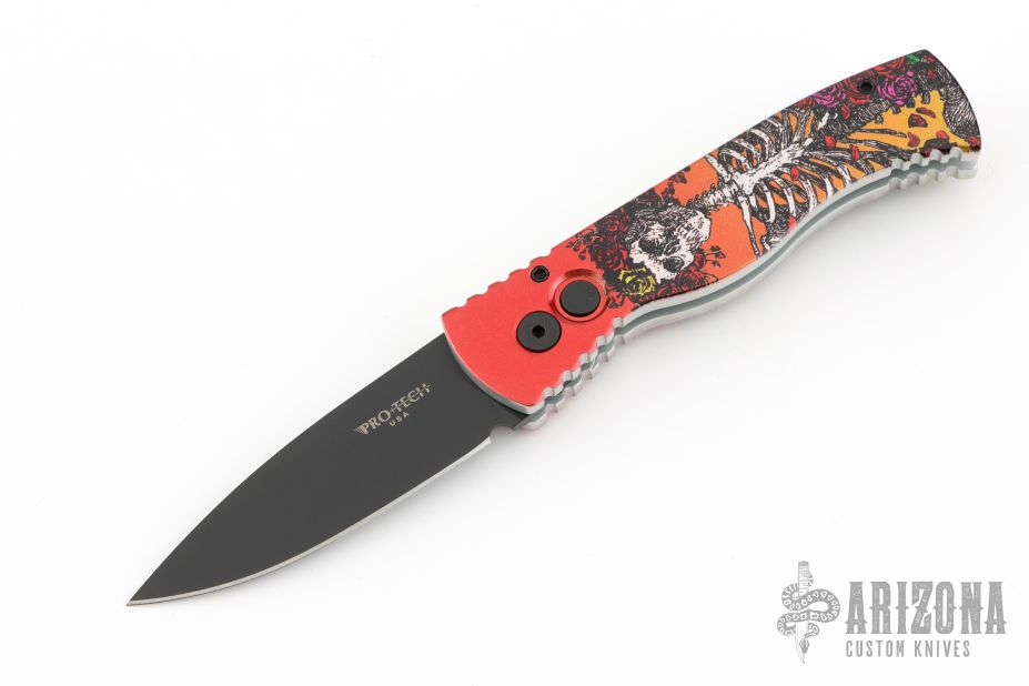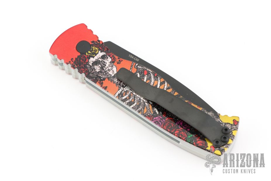 This TR-2 by Pro-Tech Knives features a black drop point blade. The handle is comprised of an aluminum frame with custom anodized skeleton with roses, black push button. The black stainless steel pocket clip is positioned for right hand, tip up carry. Includes original box and paperwork. Excellent/new condition. #95 of 100