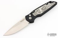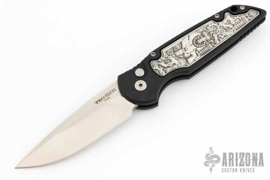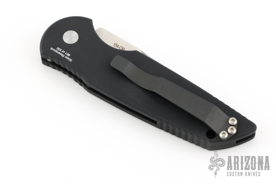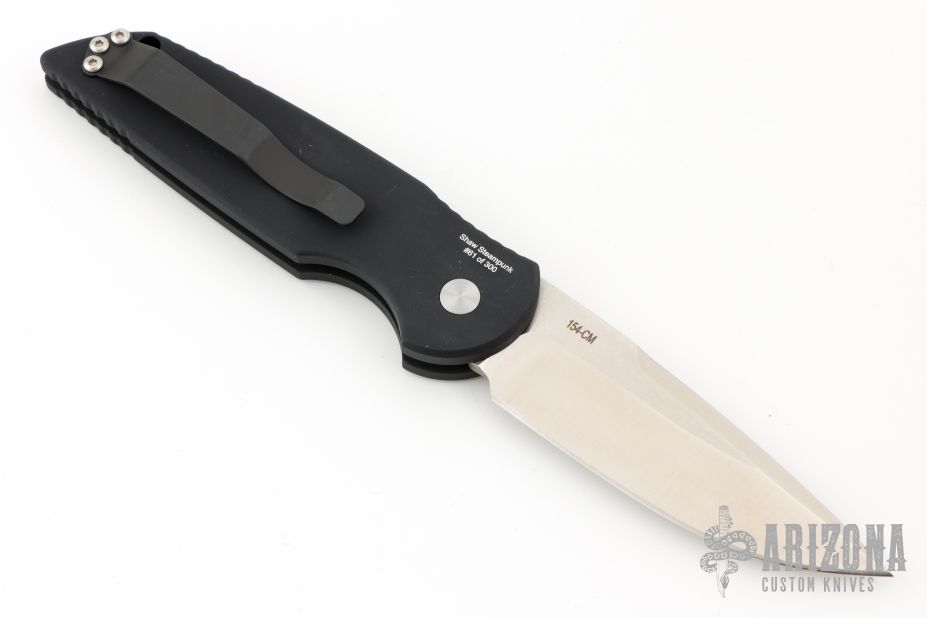 This TR-3.5 model has a black finished handle with a Shaw Steampunk inlay and a satin finished blade. The TR-3 Auto is an offering from Protech Knives. It features a 6061-T6 aluminum handle with a black finish and a nickel silver inlay. The 154-CM steel blade is satin finished with a plain edge. Black coated pocket clip and hardware finish off the design. Includes the original box and papers. #61 of 300. Excellent/new condition.