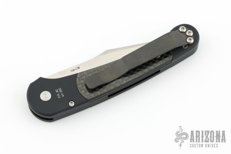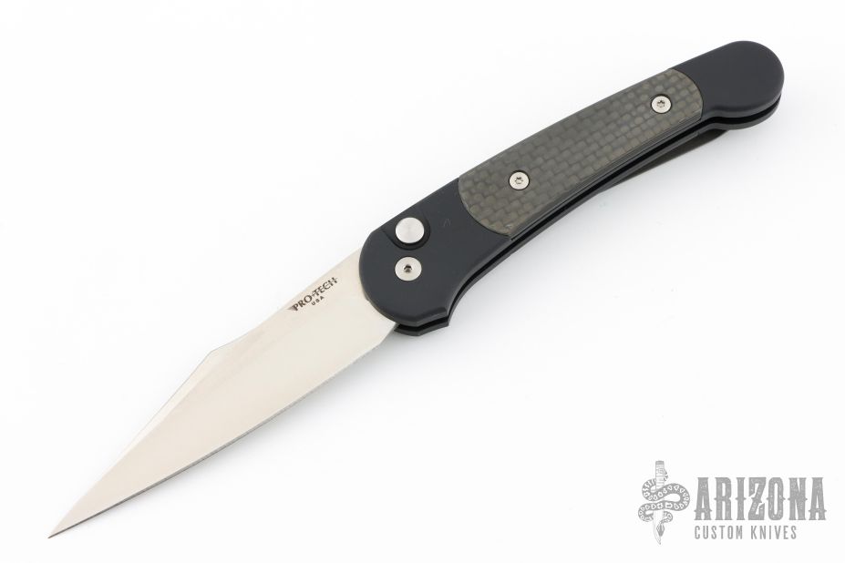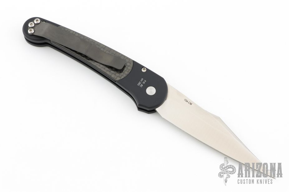 This Monaco from Pro-Tech knives features a satin finished blade. The handle has a black aluminum frame with carbon fiber inlays, tip up black stainless steel clip. Comes with original box and papers. PR2 #260. Excellent/new condition.