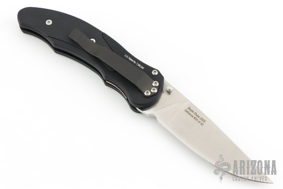 This Defiance D/A by Pro-Tech Knives was the 2009 Blade Show Special and is #24 of 50. It features a stonewash finished blade and black aluminum handle with black G10 inlays. Black stainless steel clip. Inlaid liner lock. Fires by pressing a hidden button under the front end of the inlay. Comes with original box and papers. Excellent/new condition.