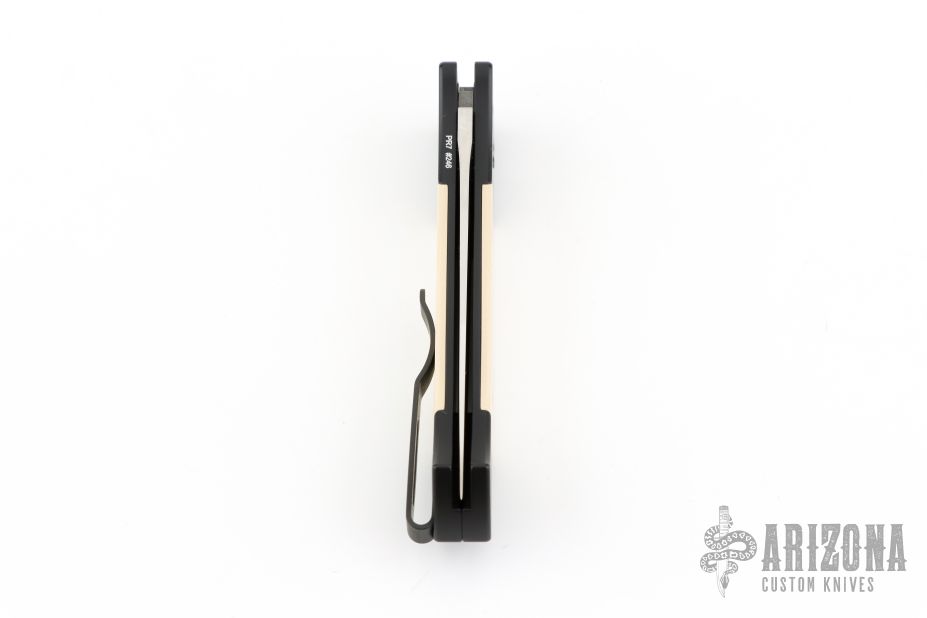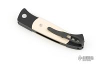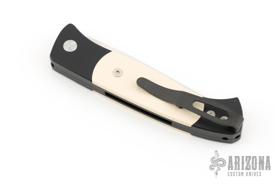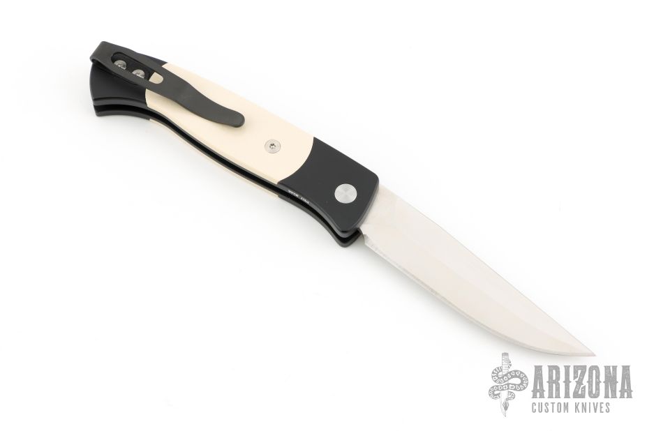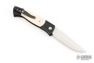 The Brend Auto by Pro-Tech Knives features Walter Brend's famous "Model 1" blade shape in a small package. Coil spring side-opening automatic. It has a satin finished blade and black aluminum handle with ivory micarta inlays, tip up black stainless steel clip. PR7 #246. Excellent/new condition. Comes with original box and papers.