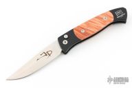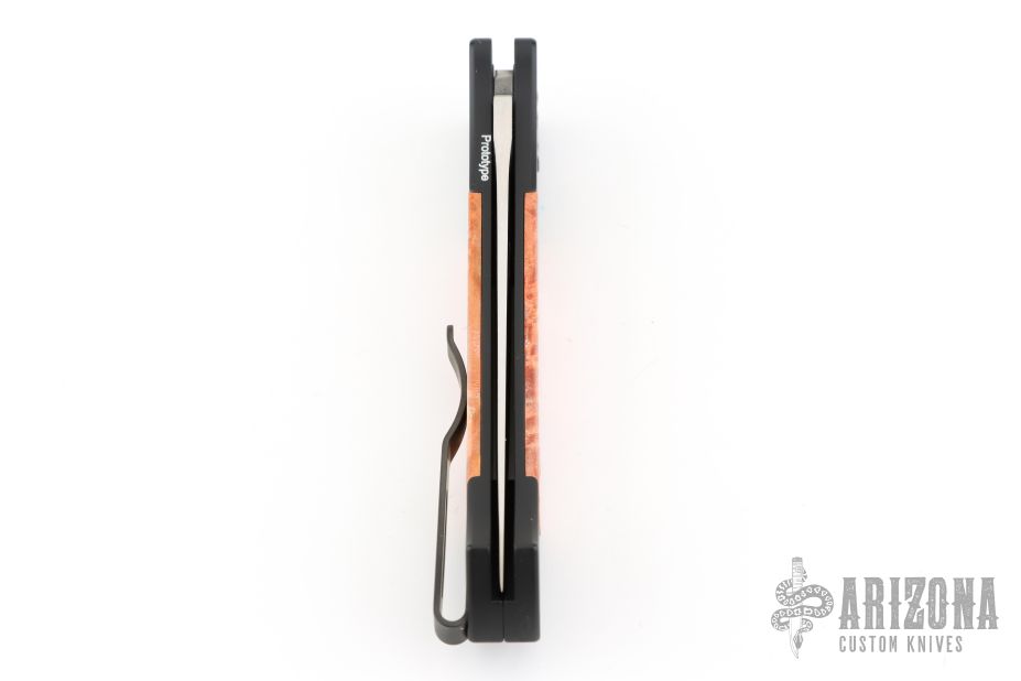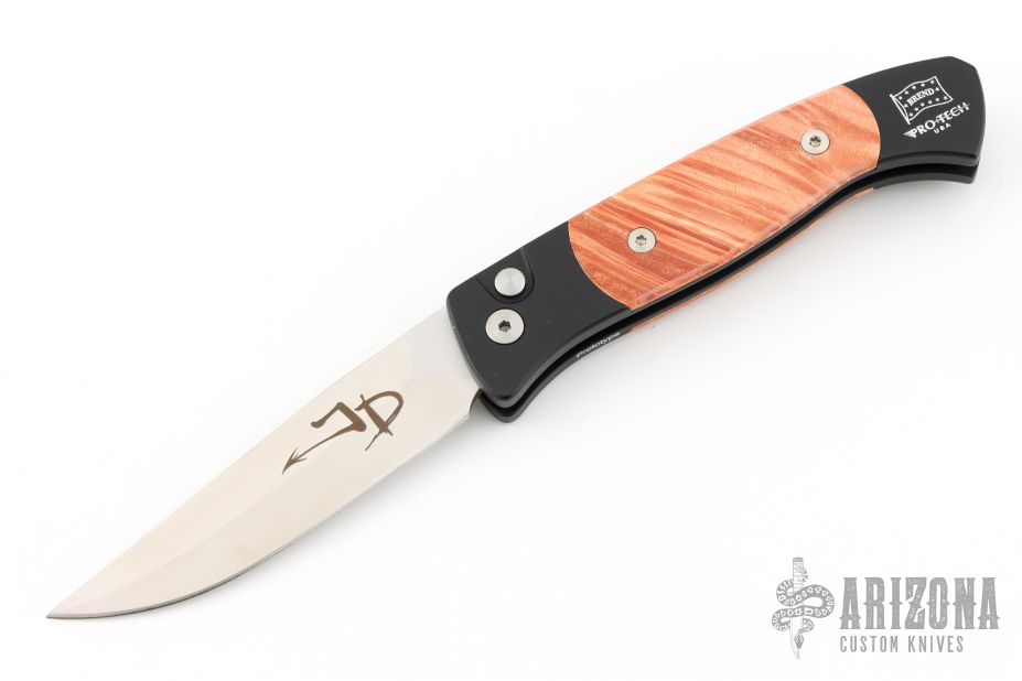 This Small Brend Auto by Pro-Tech is a Jerzee Devil Limited Edition 2018 and is the Prototype. The blade is satin finished with a false top edge. The handle has an aluminum frame with burl wood scales and a black tip up stainless steel clip. Comes with a Pro-Tech box and papers. Excellent/new condition.