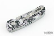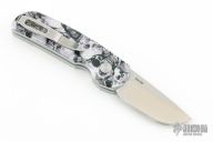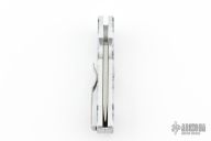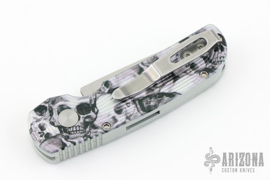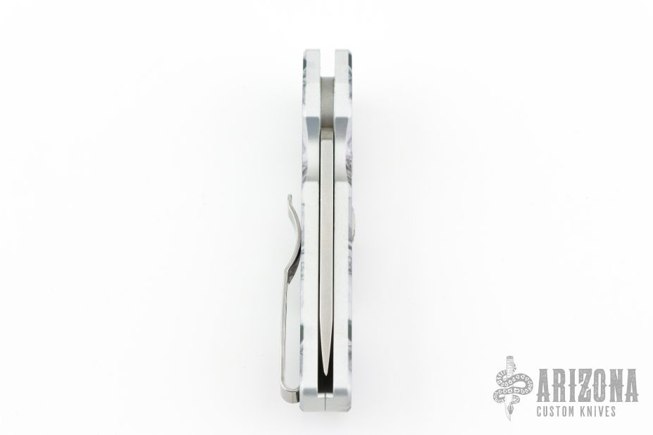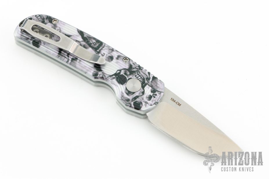 This Calmigo by Pro-Tech Knives features a California legal, satin finished drop point blade. The handle is comprised of an aluminum frame with a PK Custom anodized ramped sliding safety and mosaic push button. The steel deep carry pocket clip is positioned for right hand, tip up carry. Excellent/new condition. Comes with a Pro-Tech box and papers.