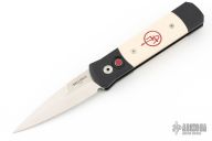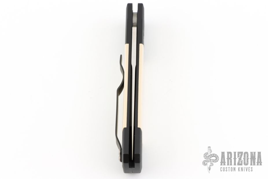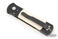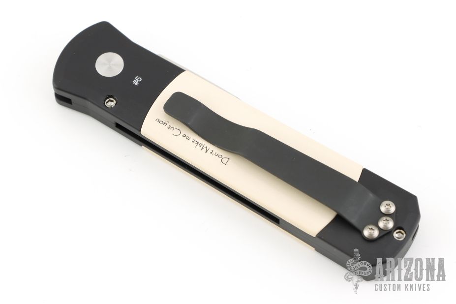 This side Godson from Pro-Tech features a satin finished spear point blade with a false top edge. The handle has a black aluminum frame with ivory micarta scales and a black stainless steel clip, tip up carry. Includes the original box and papers. Excellent/new condition.