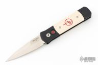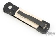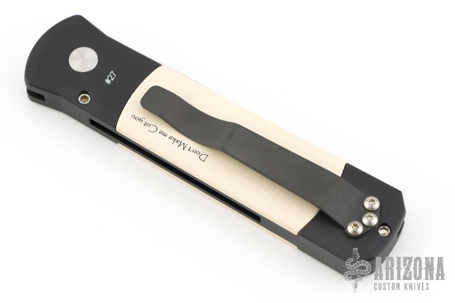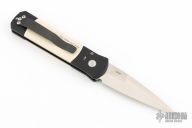 This side Godson from Pro-Tech features a satin finished spear point blade with a false top edge. The handle has a black aluminum frame with ivory micarta scales and a black stainless steel clip, tip up carry. Includes the original box and papers. Excellent/new condition.