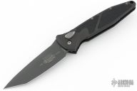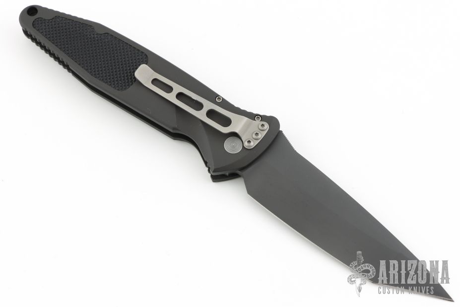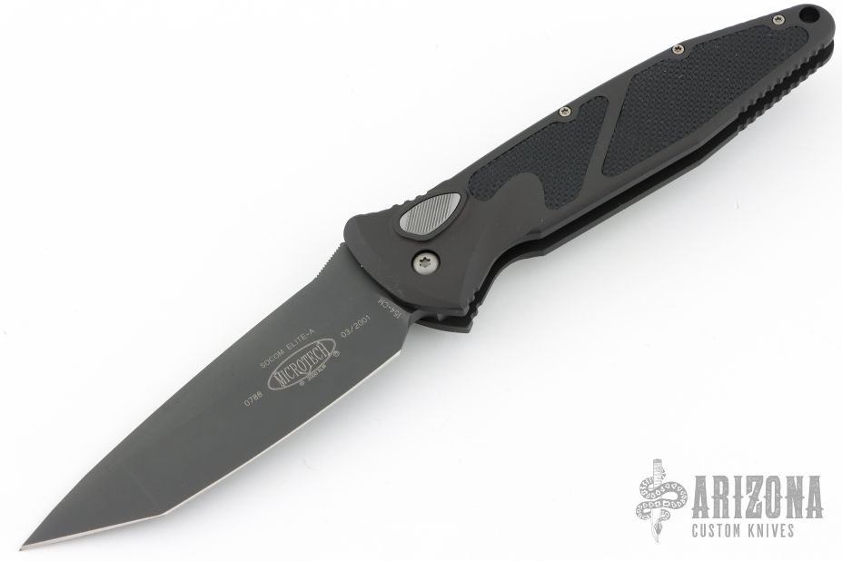 This Socom Elite auto by Microtech has a black tanto blade. The handle is aluminum with rubber non-slip inserts, tip down stainless steel clip. Includes original box, sheath and papers. S/N 0788 and dated 03/2001. Excellent condition.