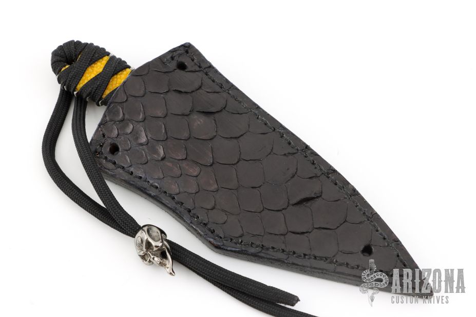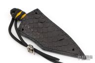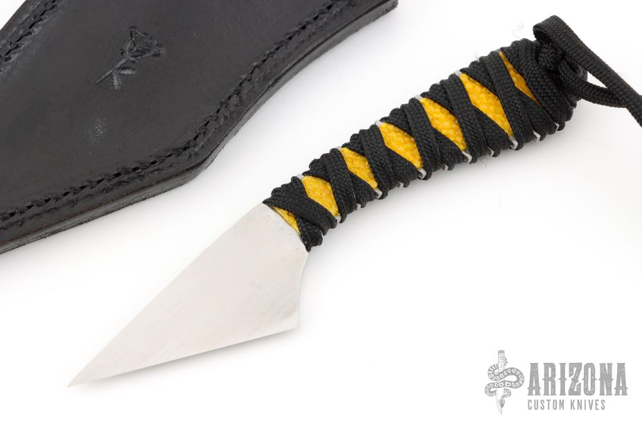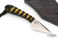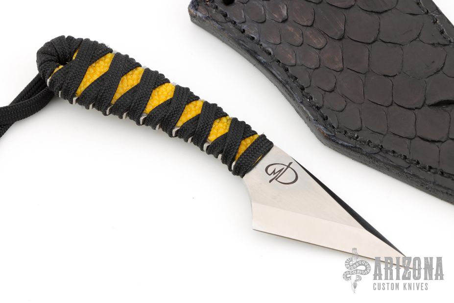 This Kiridashi by Denis Mura features a chisel ground blade with a hand rub satin finish, .116" blade stock and .985" blade depth, hidden tang construction. The handle has yellow rayskin under black cord wrap. Has lanyard with custom bead w/ makers logo. Comes with a hand-tooled gator skin black leather sheath.  Excellent Condition.