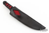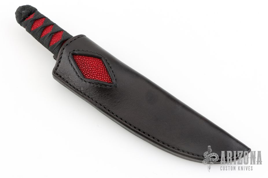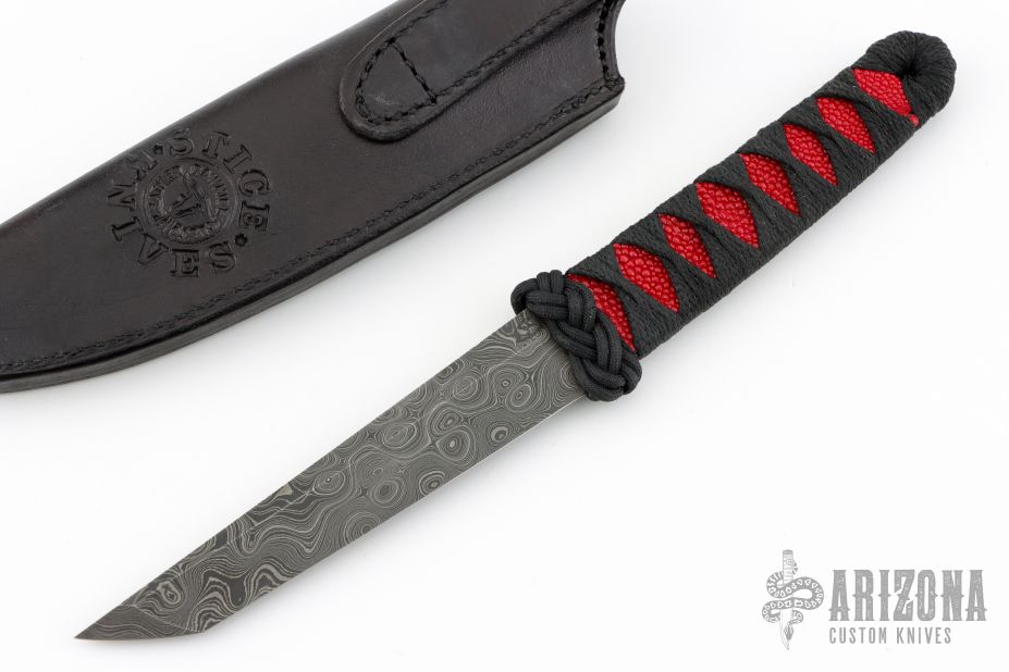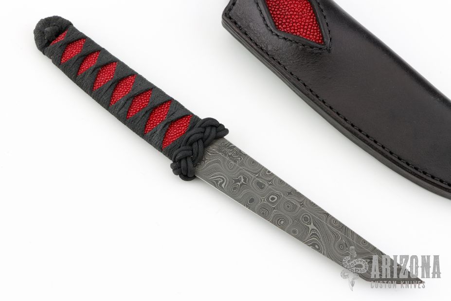 This Tanto by Doug Stice features a Damascus blade with .142" blade stock and 1.043" blade depth, hidden tang construction. The handle has black cord wrap over red sting ray skin. Comes with a black leather sheath with stingray skin inlay. Excellent condition.