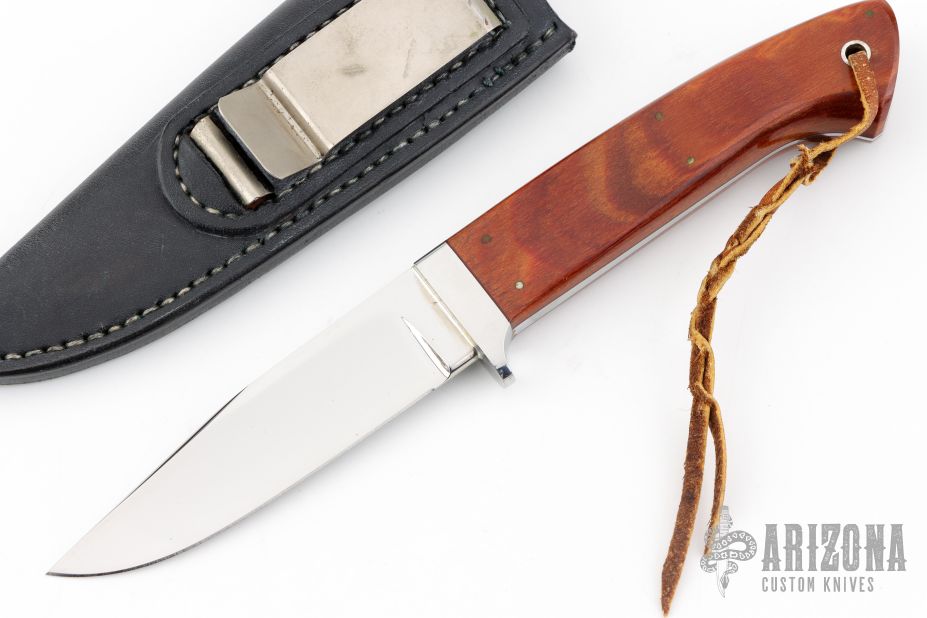This Utility Hunter by Lloyd Pendleton features a mirror polished clip point blade with .191" blade stock and .973" blade depth, full tapered tang construction. The handle has a stainless steel guard and laminated wood scales with black liners. Includes a leather sheath. Excellent condition.