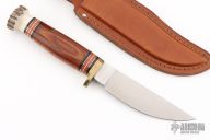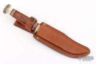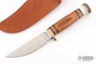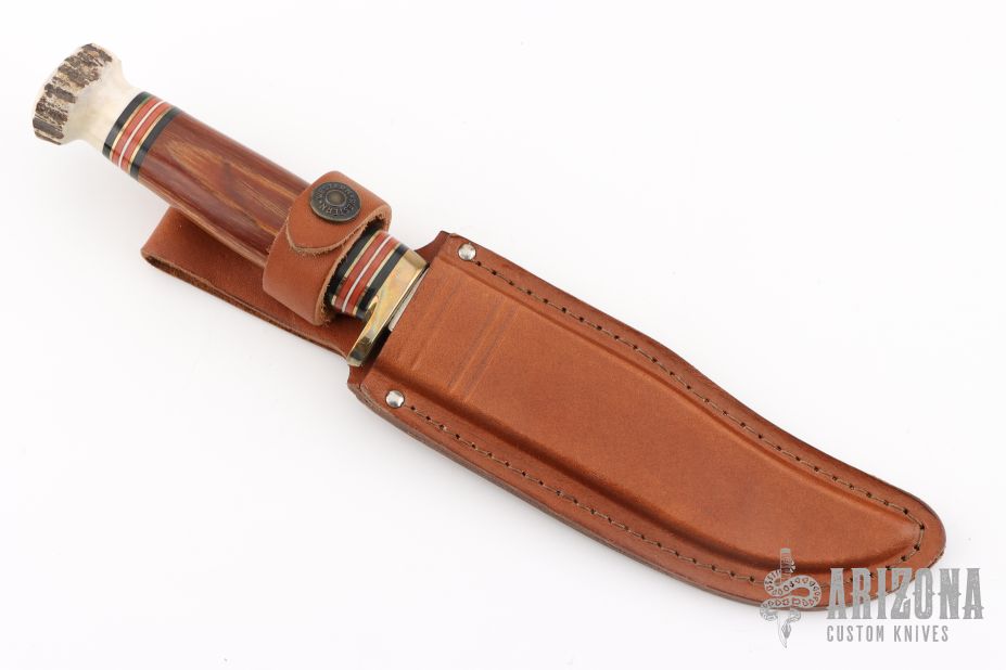 This Plainsman by Marbles features a satin finished blade, .183" blade stock and 1.022" blade depth, hidden tang construction. The handle has a brass guard, laminated wood grip with black/white/brass/red spacers and a stag butt cap. Comes with a brown leather sheath. Excellent condition.