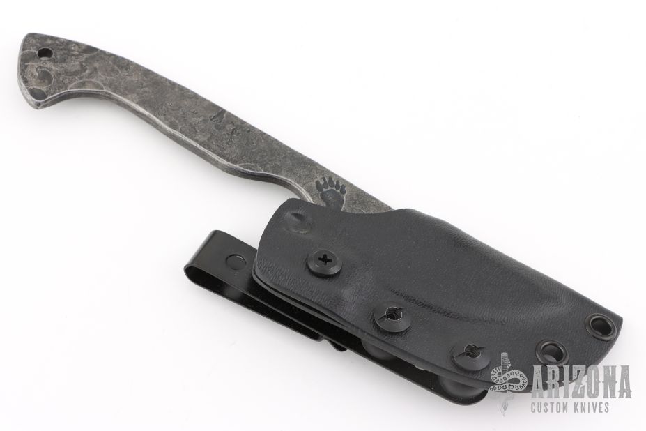 This Naked Muskrat by Grizzly Forge features a hand forged stonewashed blade with false top edge and forge finished flats and handle with lanyard hole, .176" blade stock and 1.166" blade depth, full tang construction. Comes with a kydex sheath with metal clip. Excellent condition.