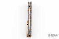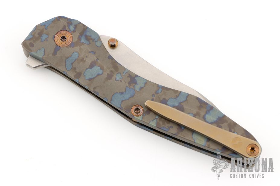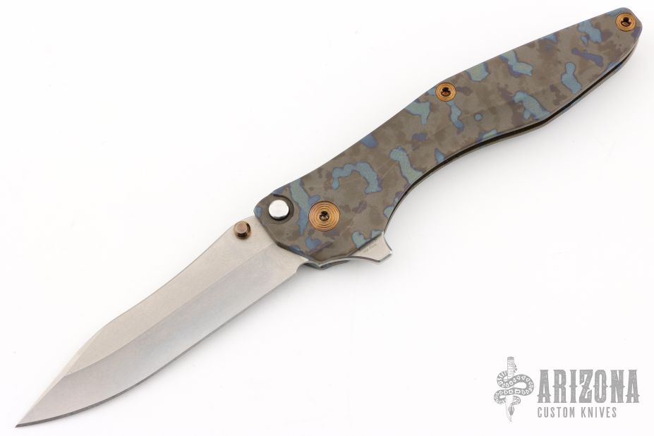 61 HRC, cryo-treated, CPM-20CV stainless drop point blade with hollow grind edge. Aerospace quality grade 5 titanium handle and fittings. Reversible titanium clip for right or left hand carry. Precision stainless bearings.
