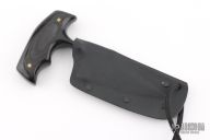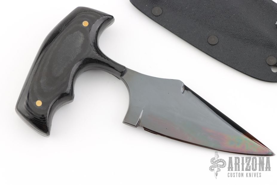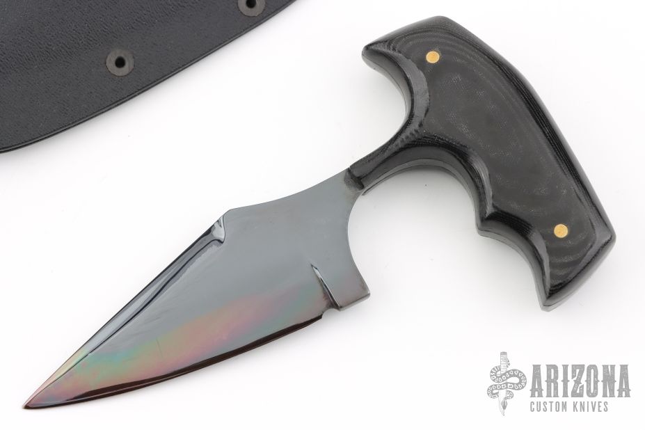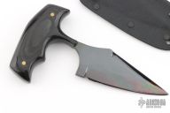 This military push dagger by Fred Perrin has a gun blued blade with false top edge and black linen micarta scales. Blade is .152" thick and 1.291" deep. Comes with Kydex neck sheath with a drop leg rig, also comes with a standard kydex sheath. Has some light scratches, otherwise excellent condition.