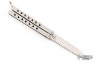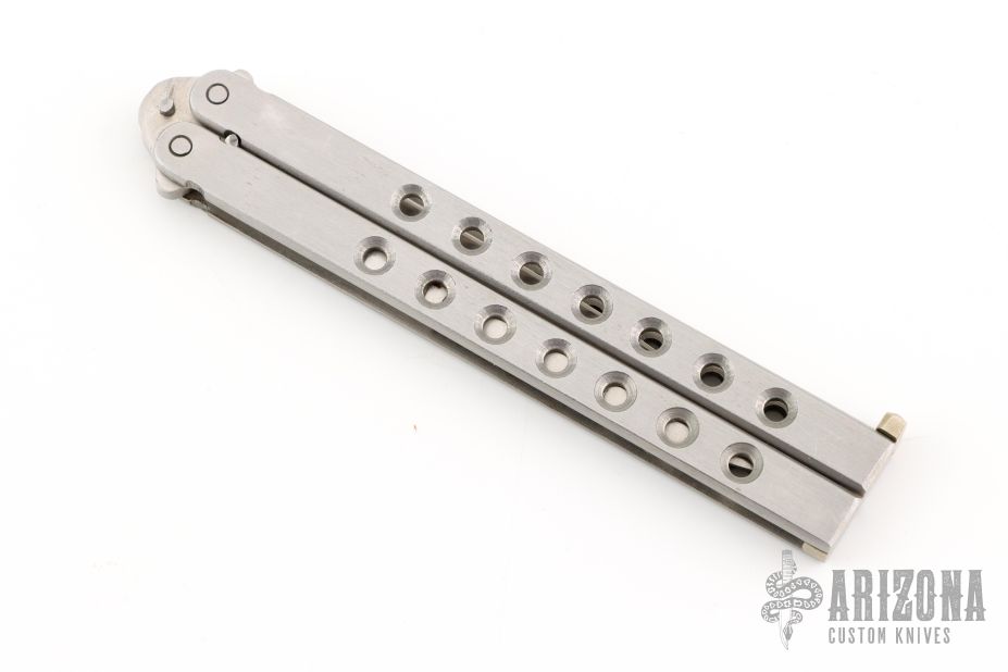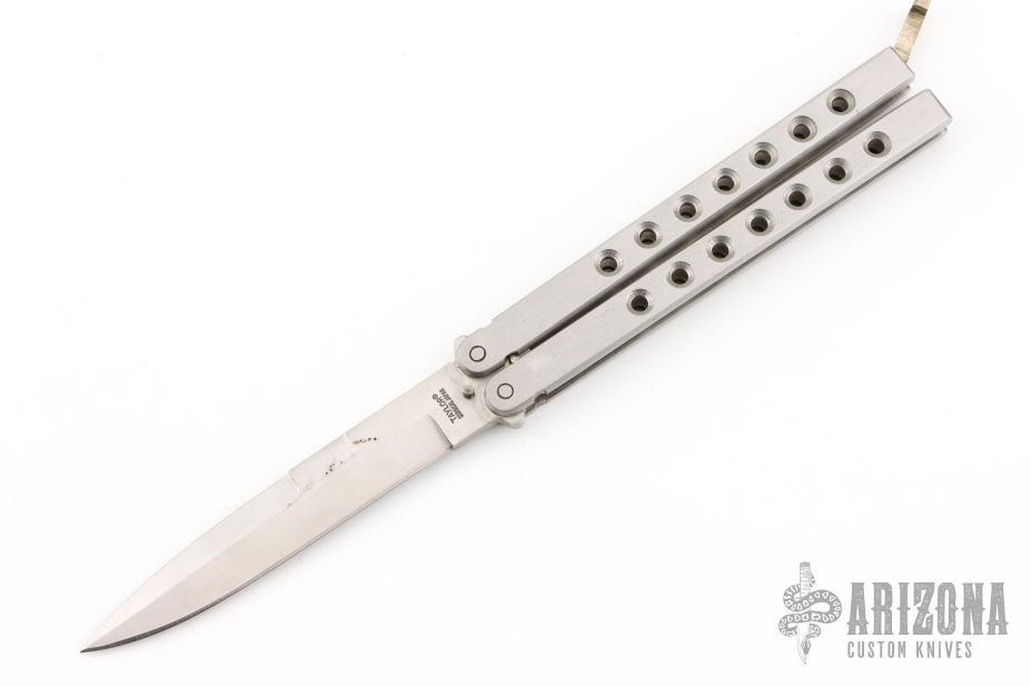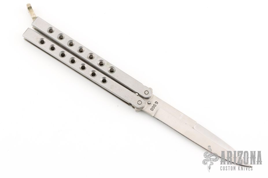 1980's classic Taylor Balisong with steel handles. Unusual find. Has a false top edge. Has some scuffs, scratches, dings and dents. Fair condition/ good user condition.