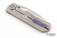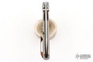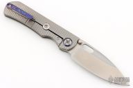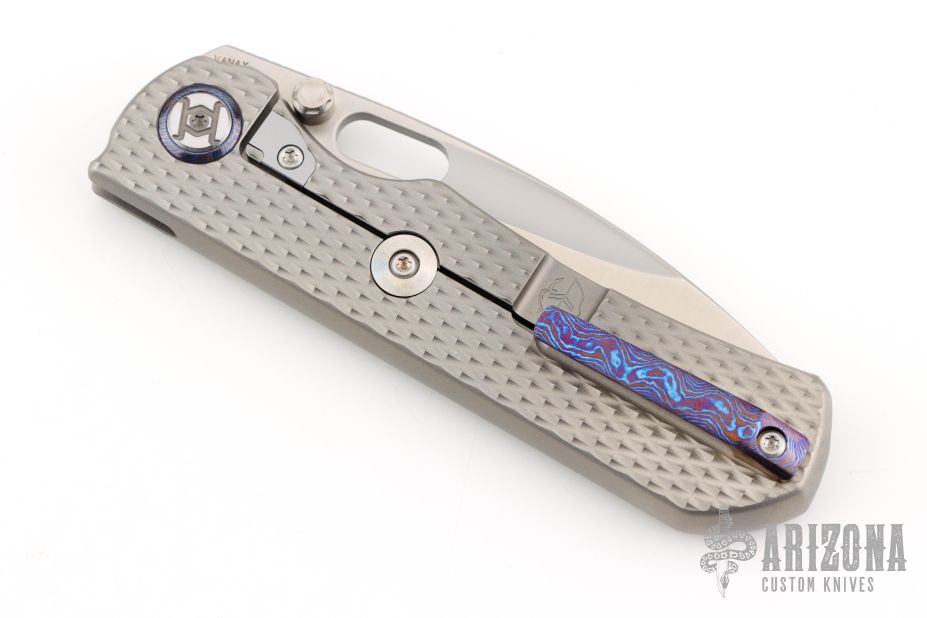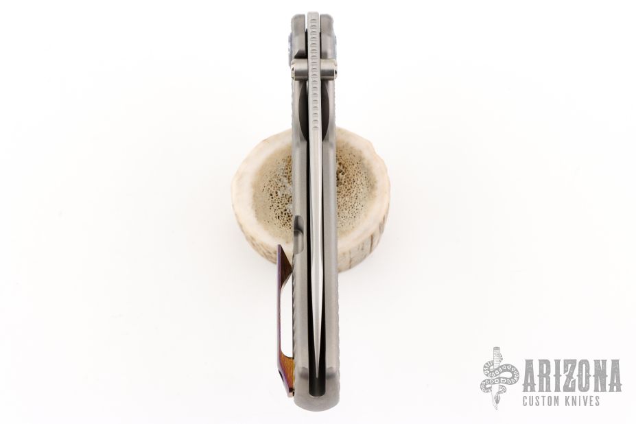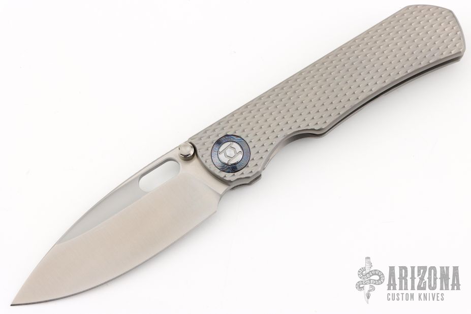 This knife by Kunwu Knives features a satin finished blade with notched thumbrest and flipper. The handle has a textured titanium integral frame, mokuti pivot collar and tip up clip. Comes with original box, extra hardware and papers. Vanex blade steel. Excellent condition.