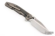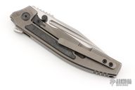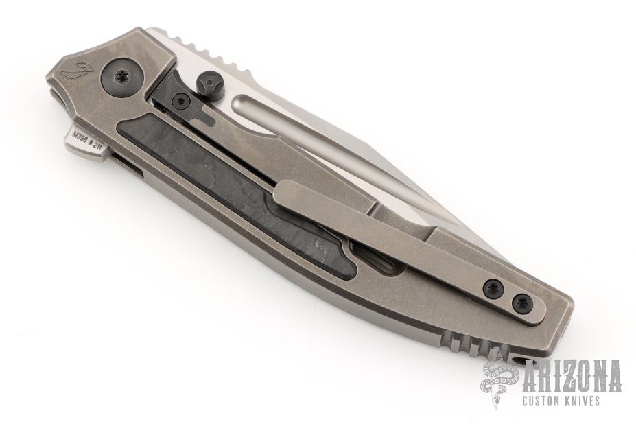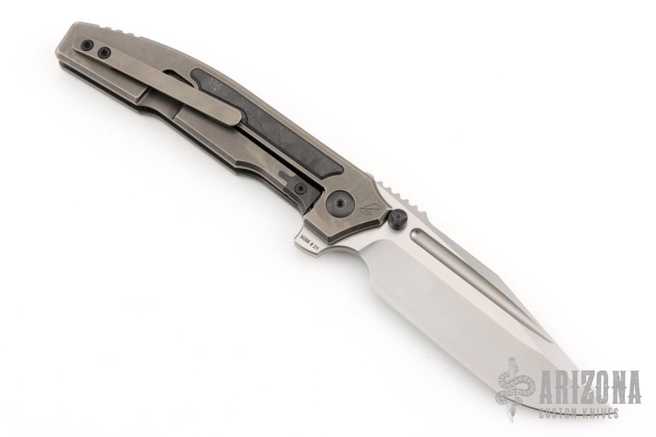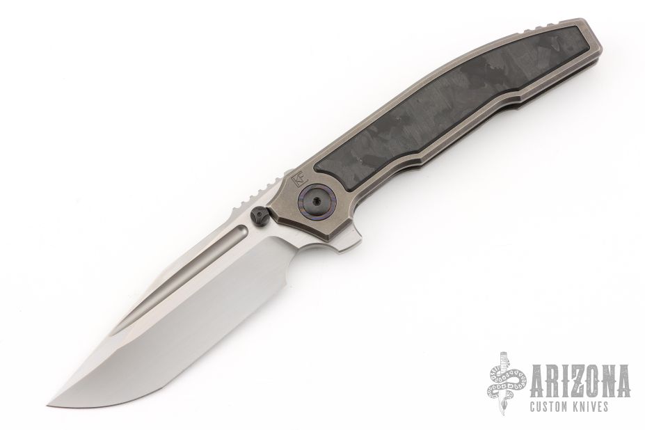 This Snafu 2024 Integral Flipper by Custom Knife Factory is a Peter Rassenti design, it features a two tone blade with notched thumbrest and flipper. The handle has a tumble finished titanium frame and tip up clip, ZircuTi pivot collars, carbon fiber inlays. Rides on bearings, nice detent, lockup and blade seating. Has a stainless lockface insert. Comes with zippered case and COA dated 4-25 #211. Excellent condition.