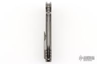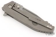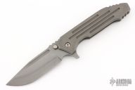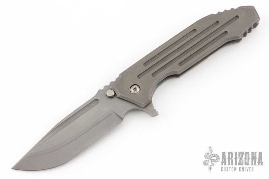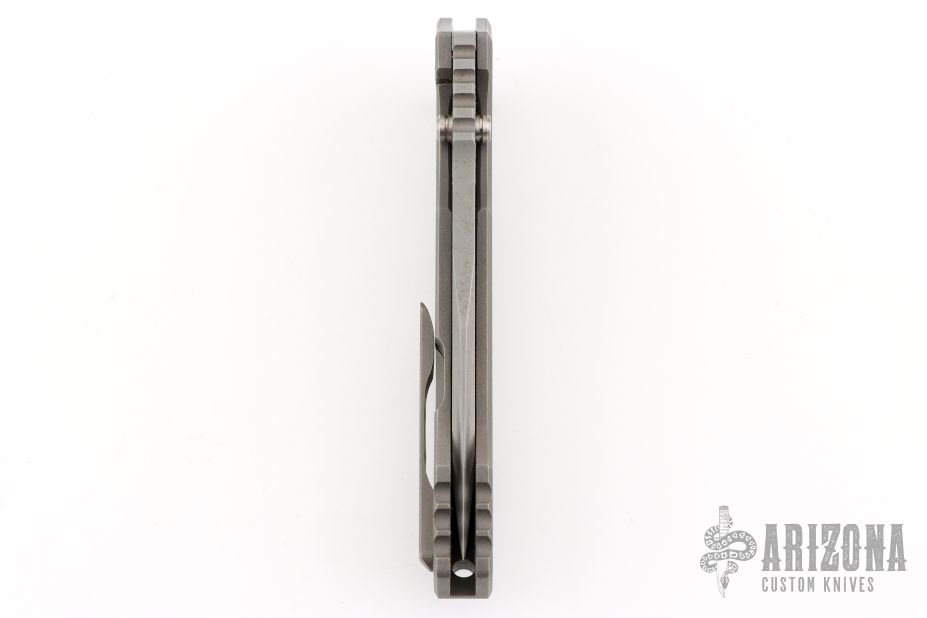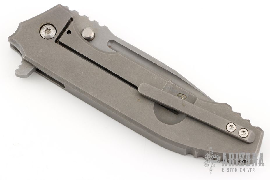 This Peter Rassenti Custom SNAFU integral framelock folder features an acid stonewashed blade with notched thumbrest, flipper and dual thumbstuds. The integral handle is stonewashed titanium with fullers, a titanium clip positioned for tip up carry. Edges are beveled. Very smooth action, rides on bearings, blade is centered and has no play whatsoever when opened. Outstanding work from Peter. Has comes marks on the blade, otherwise excellent condition. Comes with a zippered case.