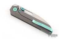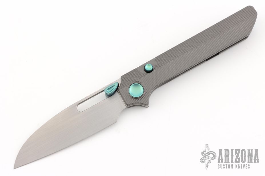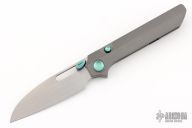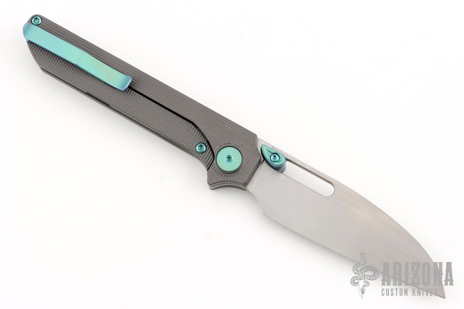 This SLIM by Golden Designworks features a hand rub satin finished blade with thumbhole, dual thumbstuds and notched thumbrest. Works well as a front flipper. The handle has milled and smoke finished titanium scales, sage anodized titanium backspacer and tip up clip. Comes with original box, zippered case and papers. Excellent condition.
