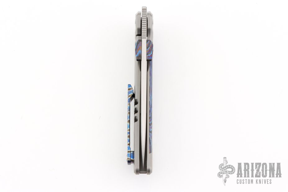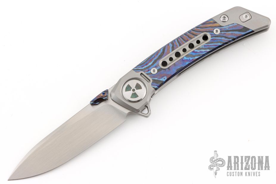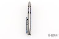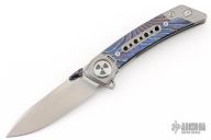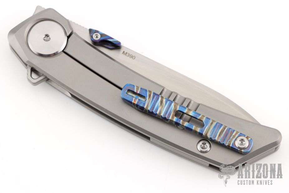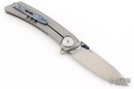 This Framelock Flipper by Lemifshe features a hand rub satin finished blade with dual ZircuTi thumbstuds, notched thumbrest and flipper. The handle has a bead blasted titanium frame with ZircuTi inlay and tip up clip, titanium backspacer with lanyard pin. Reversible clip. Comes with a zippered case. Excellent condition.