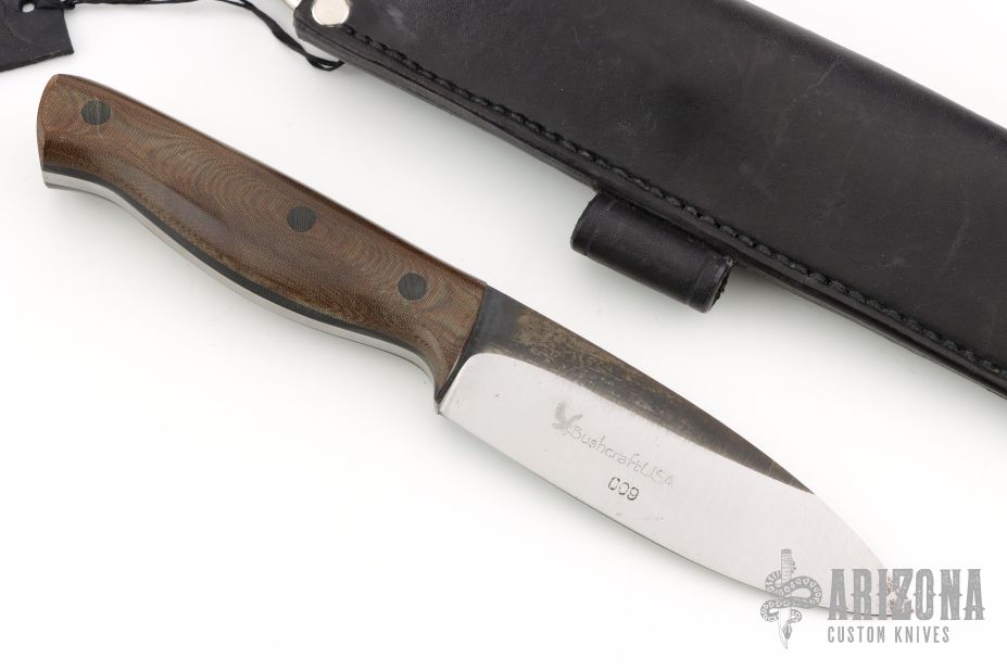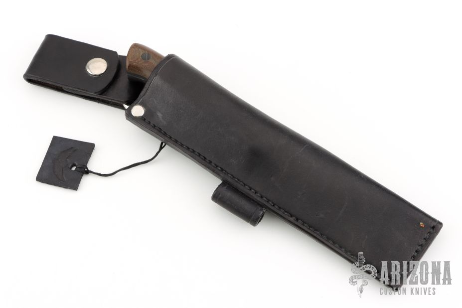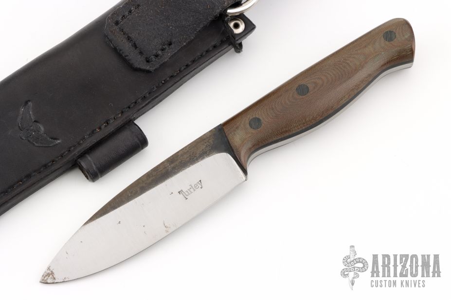 This Knife from Turley Knives features a satin finish drop point blade with black flats, .190" blade stock and 1.314" blade depth, full tang construction. The handle has green linen micarta scales over black G-10 liners. Includes a black leather sheath with belt loop. Has some scratches and oxidation spots, otherwise good user condition.