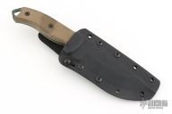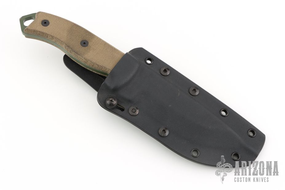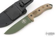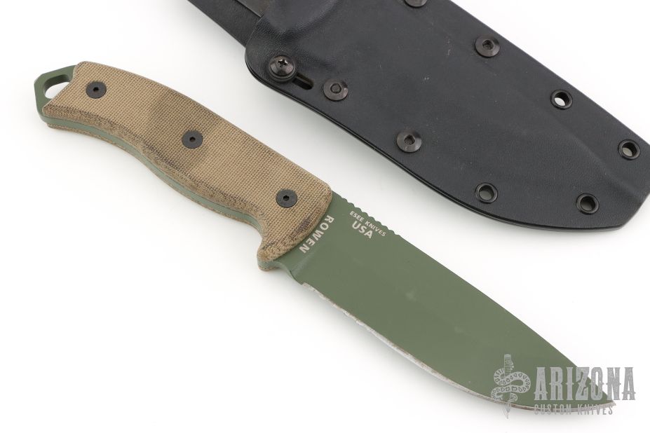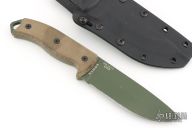 This 5P-OD fixed blade from ESEE Knives features a green powder coated and textured drop point blade with notched thumb rest. 1/4" blade stock and 1 1/2" blade depth. Scales are tan linen micarta with bow drill divot. Lanyard bail or skull crusher at butt. Includes kydex sheath. Some minor staining on blade edge, but otherwise good condition.