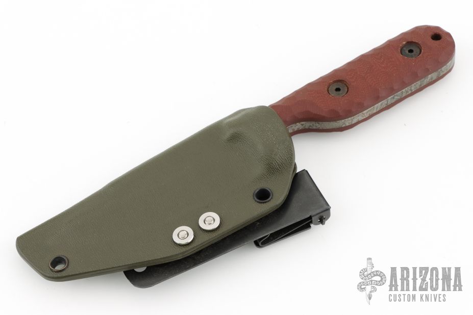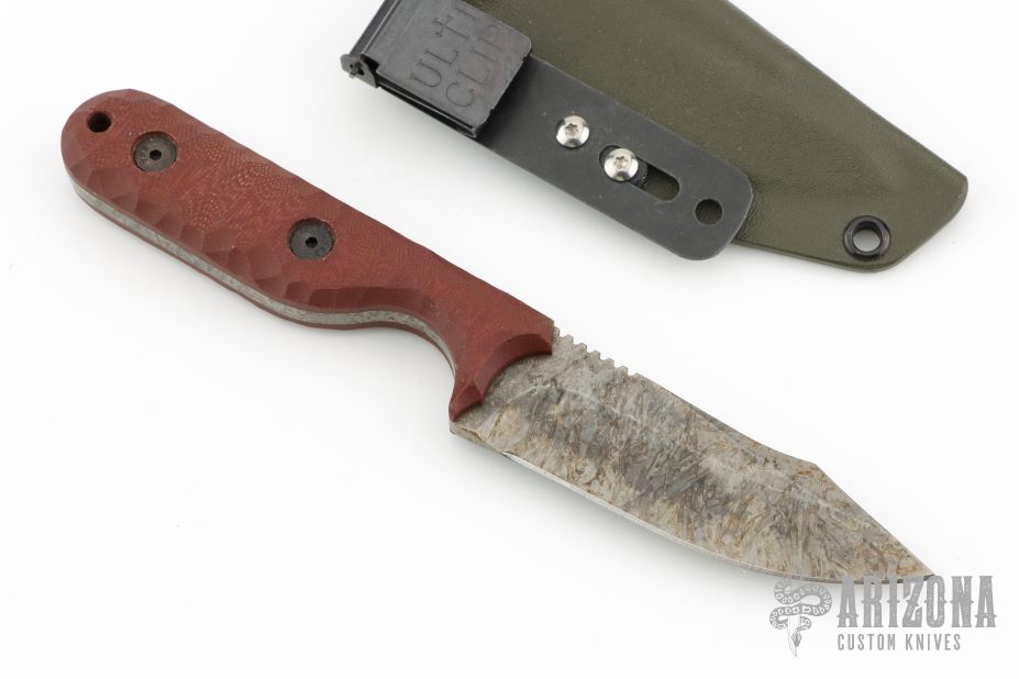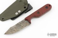 This Gamboa by Joe Watson features a forced patina blade with notched thumbrest, .197" blade stock and 1.142" blade depth, full tang construction. The handle has sculpted red G-10 scales. Comes with a kydex sheath. Excellent condition.
