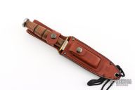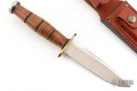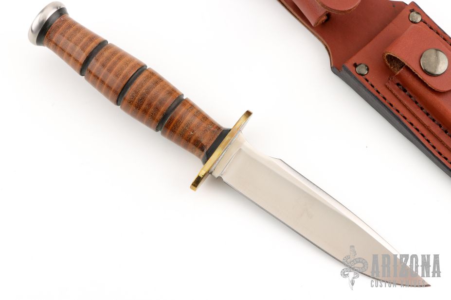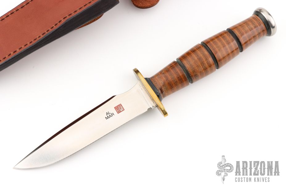 This knife by Al Mar features a satin finished blade with .154" blade stock and 1.091" blade depth, hidden tang construction. The handle has a brass guard, stainless steel butt, stacked leather handle. Comes with original leather sheath and box. Excellent condition.