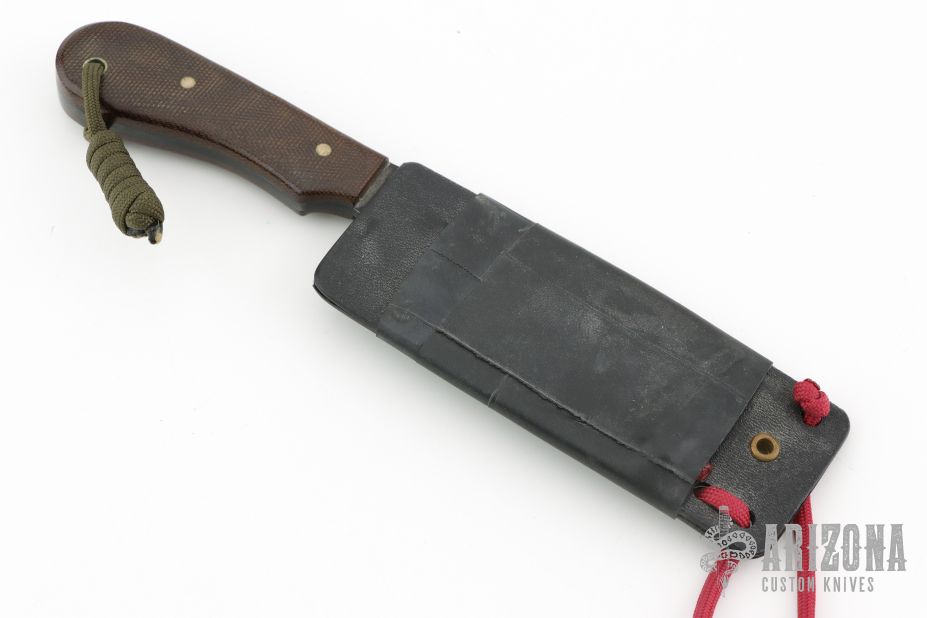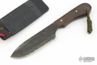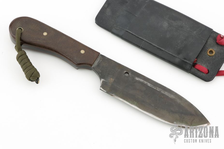 This NRGS by Newt Livesay features a drop point blade with .117" blade stock and 1.304" blade depth, full tang construction. The handle has brown canvas micarta scales, nickel silver pins and lanyard hole at the butt. Comes with a kydex sheath. Has some scratches and patina, otherwise good condition.
