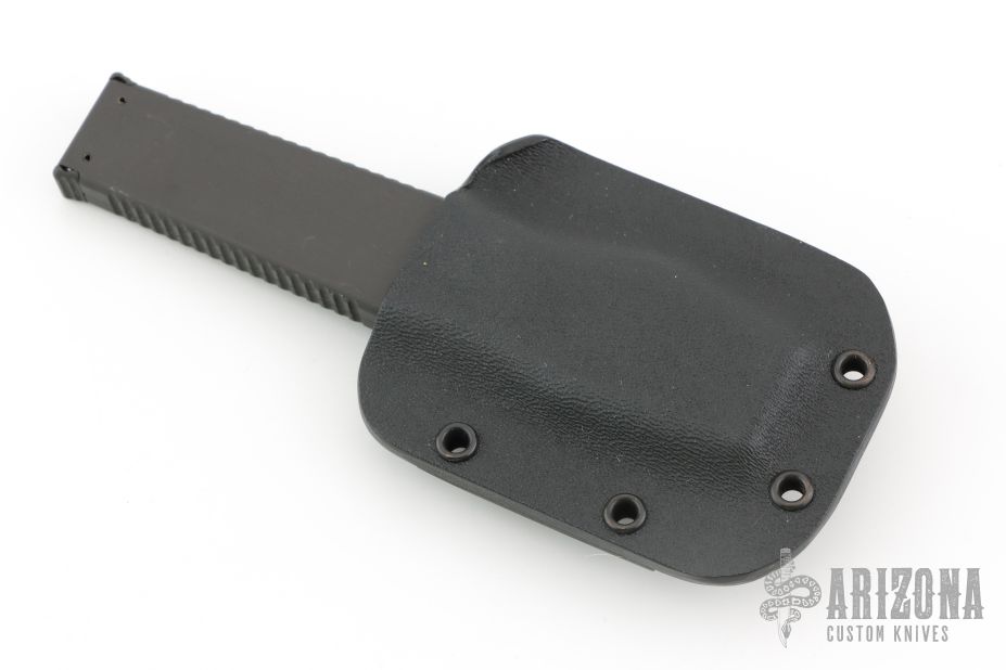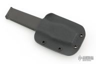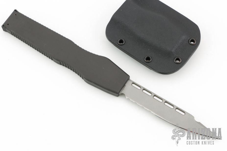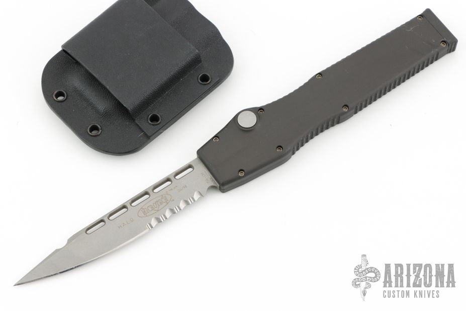 This HALO II is the clip point blade model in the HALO series by Microtech Knives. Single action, side positioned button for firing. Closure via a reverse charging handle in the rear of the frame. Contoured frame grip with milled ribbing on the frame spine and belly. This Halo II has a bead blasted clip point partially serrated blade. Dated 04/98. Kydex belt sheath. Has some light scuffs, otherwise excellent condition.