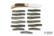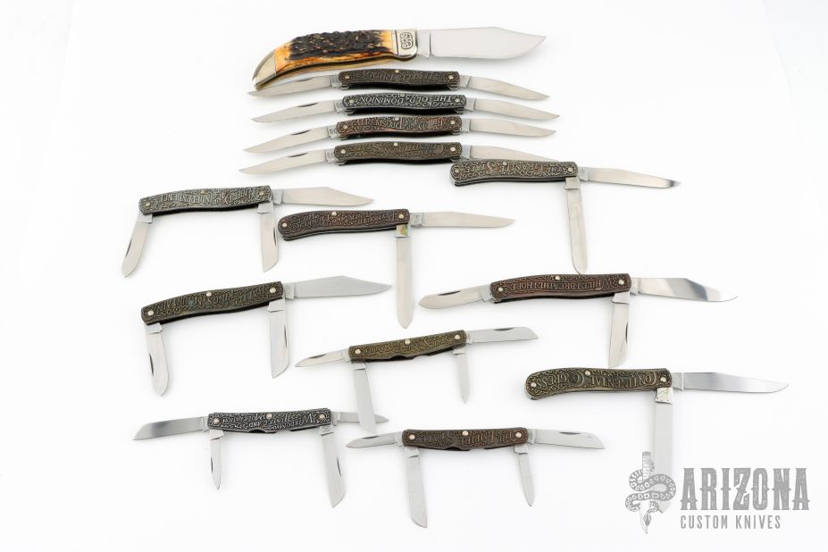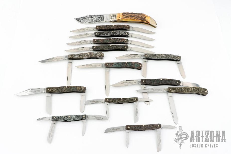 Each knife varies slightly by style (stockman, trapper, etc.) and includes custom handles with state names, founding years, seals, and mottos. For example: