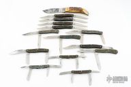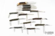 This collectible Parker Schrade folding knife set commemorates the U.S. Bicentennial (1776–1976) and includes 14 knives total, all in the original display case with boxes. The set features: