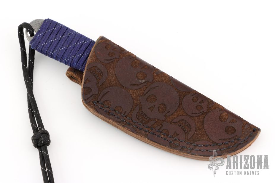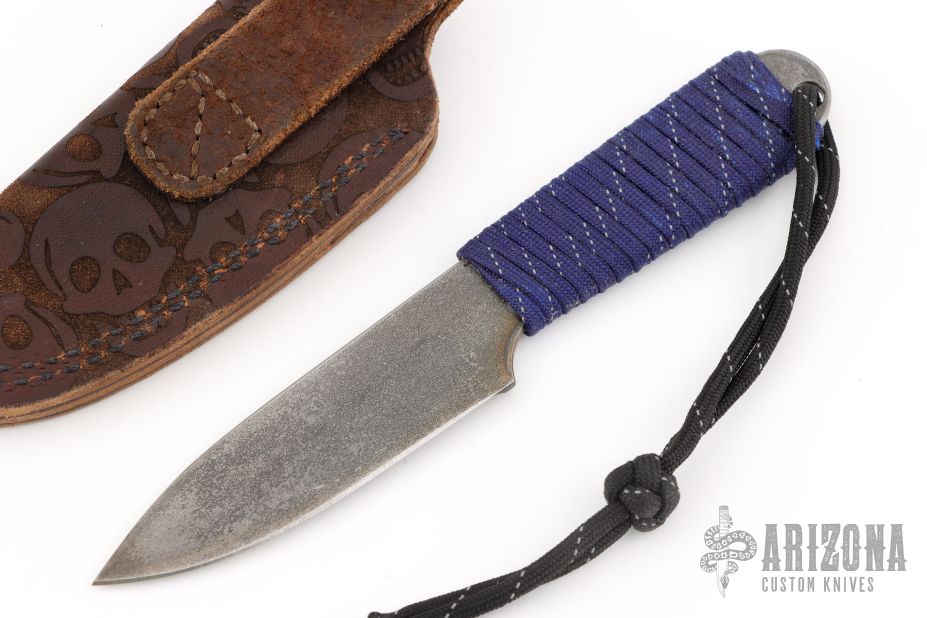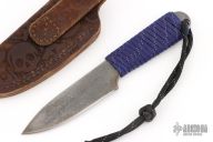 This Boss by Mike Snody features a satin finished chisel ground blade with raw bar finished flats, .115" blade stock and 1.067" blade depth, full tang construction with paracord wrap. Comes with a brown leather sheath. Excellent condition.