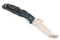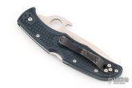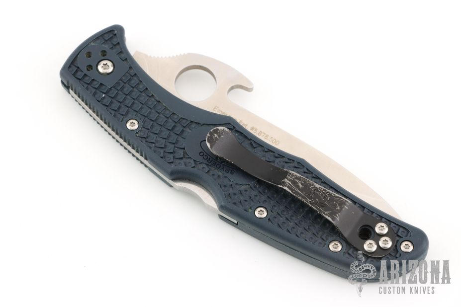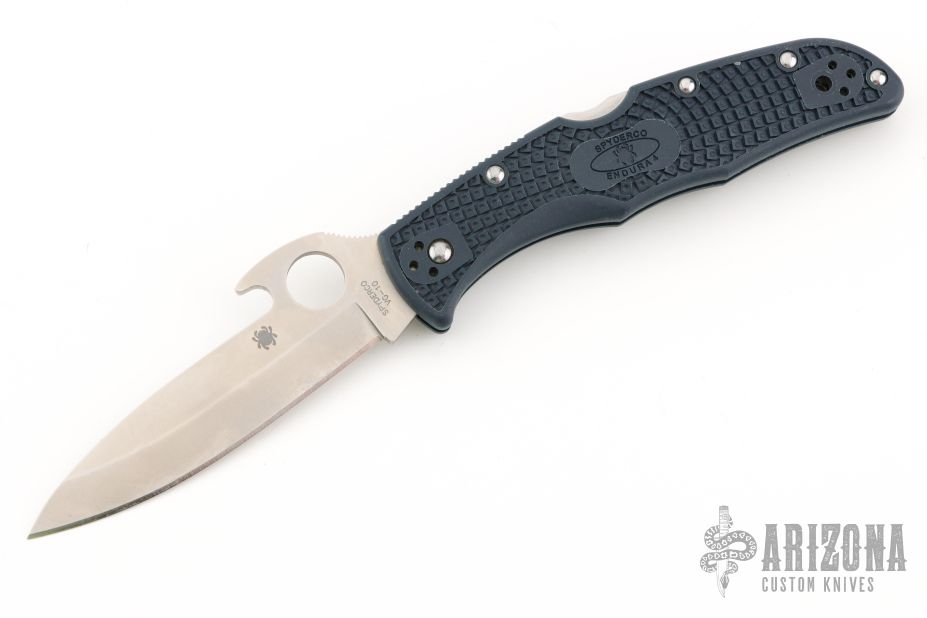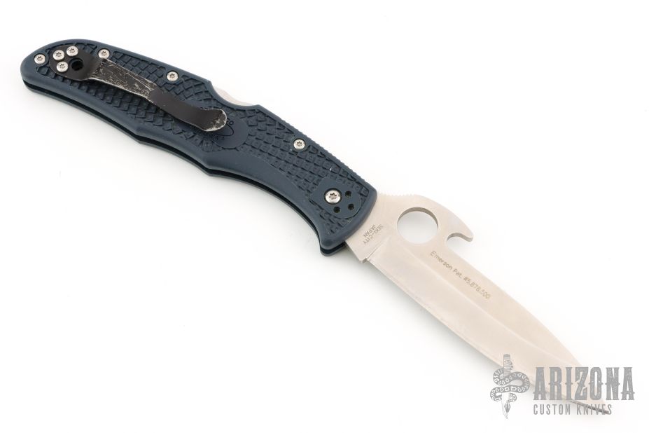 This Endura 4 by Spyderco knives has a satin finished blade with Emerson wave feature, notched thumbramp, blue FRN covers, steel rockerbars, stainless steel clip. Has some scratches and wear on the clip, otherwise good condition.