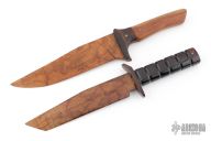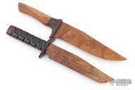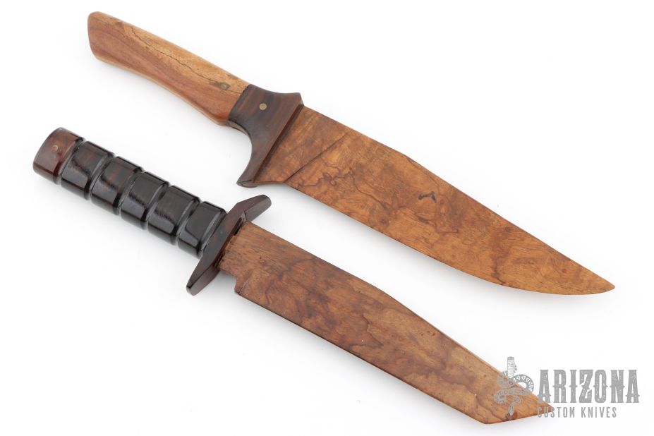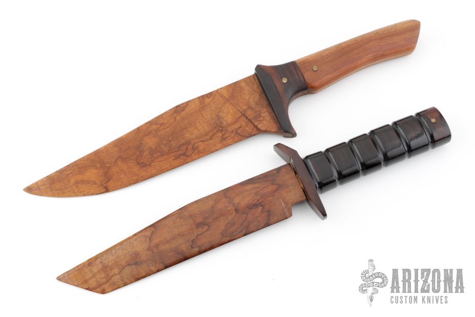 These two knives are made of wood and are intended for display. The first one is a large hunter or Bowie, the blade is made from exotic wood and has .227" blade stock and 1.849" blade depth, hidden/frame tang construction. The handle has a dark wood guard and a wood grip with brass pins. The Tanto is made from exotic wood and has .221" blade stock and 1.534" blade depth, hidden tang construction. The handle has a dark wood guard and a wood grip. Excellent condition.