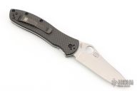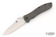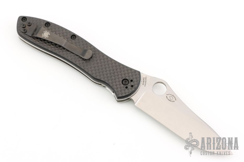 This Gayle Bradley liner lock folder by Spyderco features a satin finish blade with thumb hole. Carbon fiber pattern G-10 scales, polished stainless steel liners, and black coated stainless steel pocket clip, tip up carry, 4 way reversible. Strong lock up, nice detent and blade seating is center. Comes with original box and papers. Excellent condition.