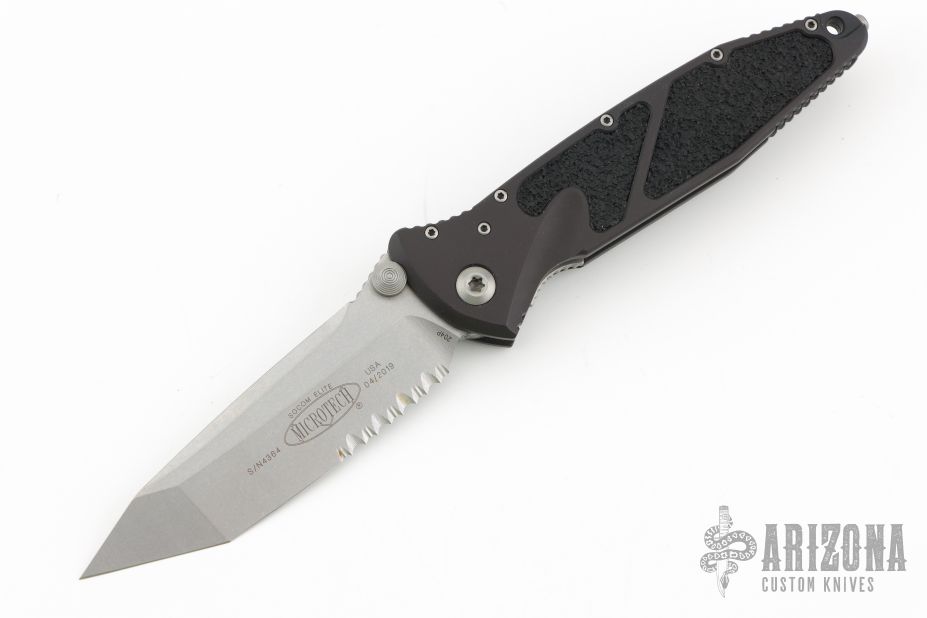 This Socom Elite manual linerlock folder by Microtech Knives has a stonewashed partially serrated tanto blade with notched thumbrest and dual thumbstuds. Has a black aluminum handle with non-slip inlays, tip down blasted stainless steel clip. Serial number 4364 and dated 04/2019. Has a couple light scuffs/scratches, otherwise excellent condition.