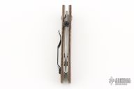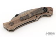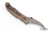 This Elvia by Emerson Knives features a Thunderstorm Finished hawkbill blade with a thumbdisc. The handle has brown canvas micarta scales, titanium liners, black stainless steel tip up clip. Comes with original box and papers. Excellent Condition.