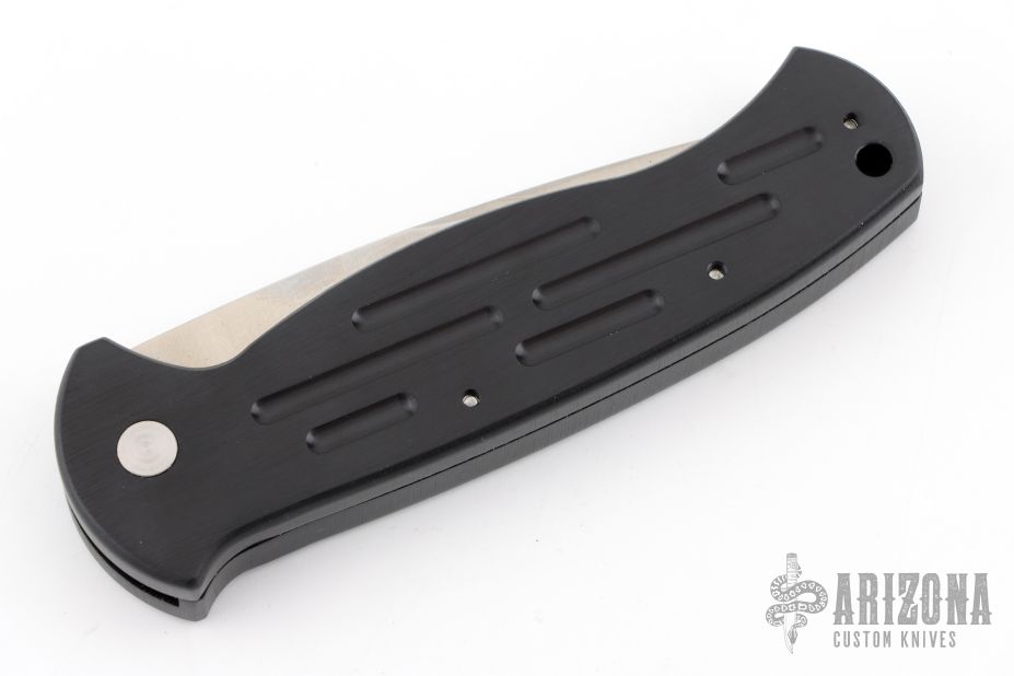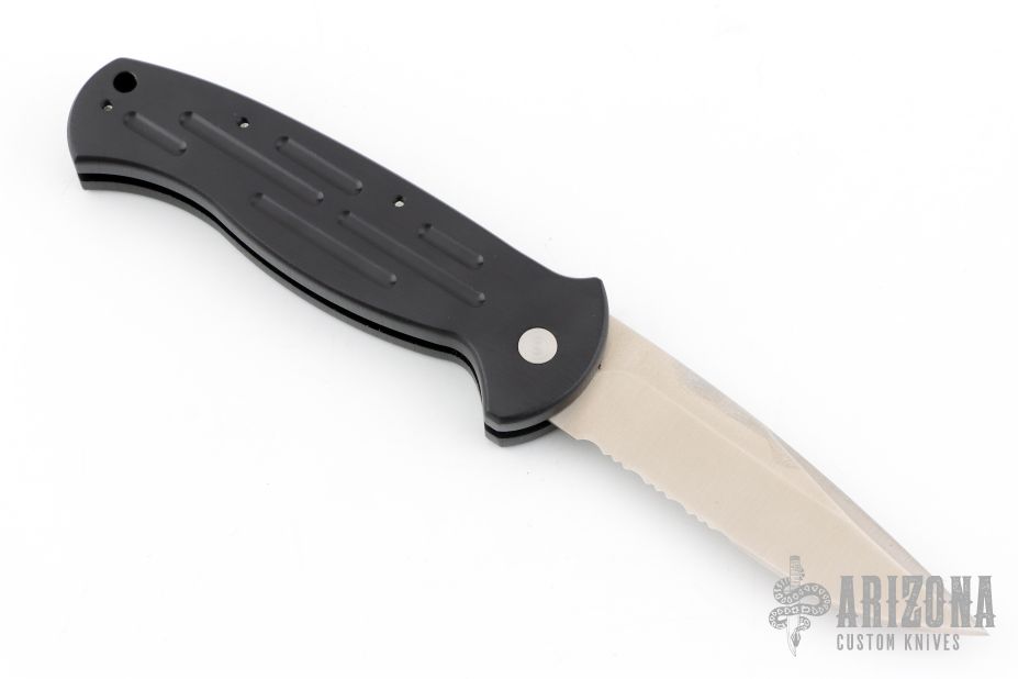 This 9000S AFO from Benchmade features a satin finished drop point blade with partial serrations and swedge. The handle is comprised of a black anodized and milled aluminum frame with a lanyard hole in pommel. Marked 021/100. Excellent condition. Comes with original sheath.