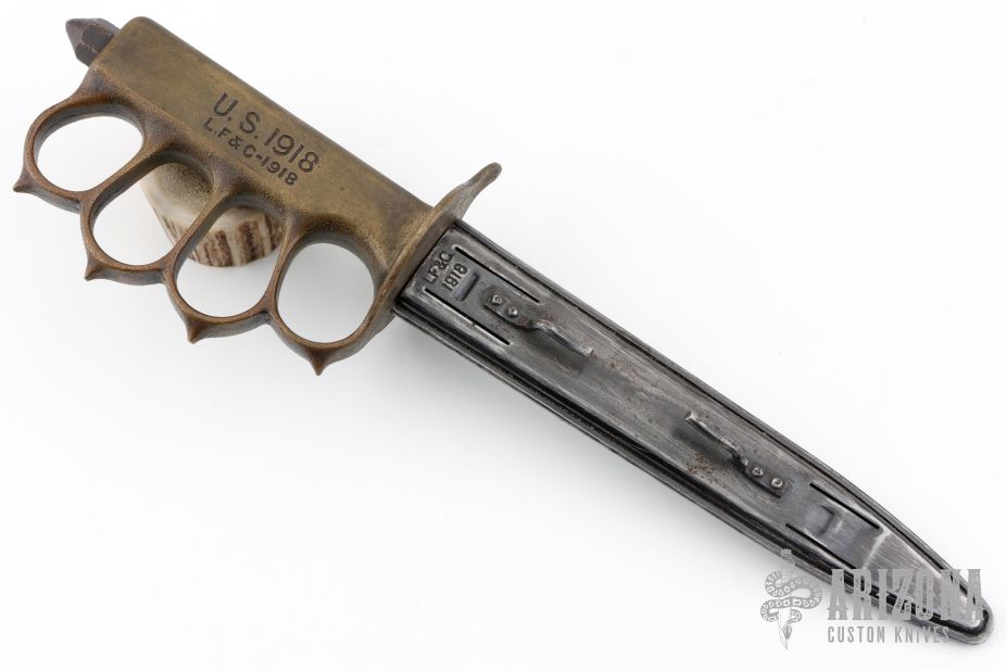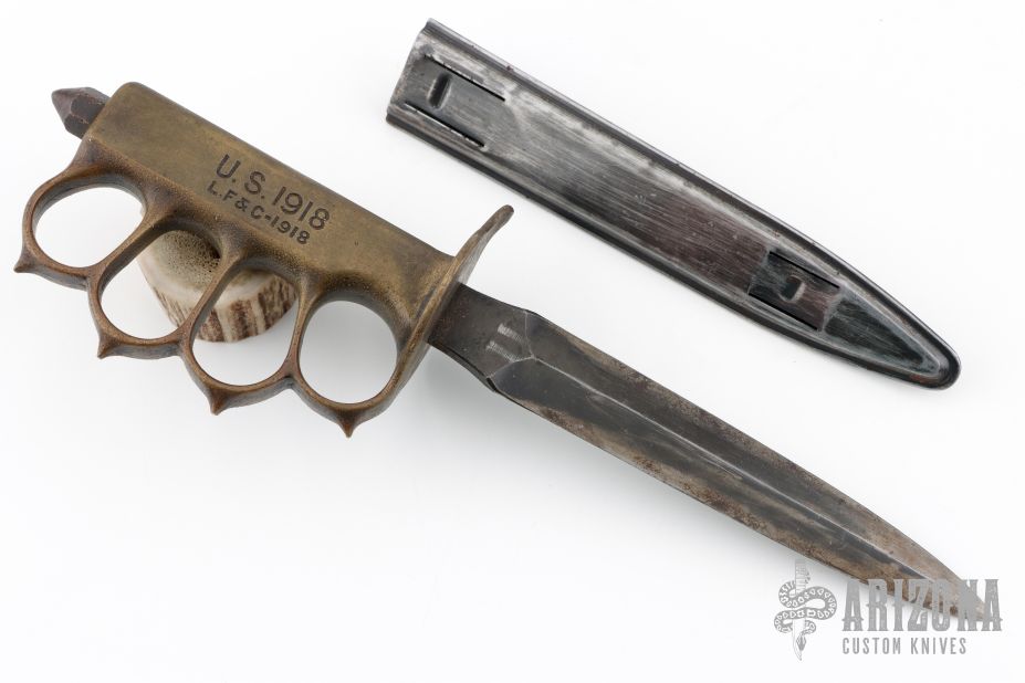 Extremely hard to find. This is a WWI trench knife made by L.F & C. Cast Bronze handle with U.S. 1918 stamped. Blade in excellent shape for its age. Comes with a metal scabbard with tabs intact, this sheath may be a reproduction, it looks a little different than the others. Has some scratches and light oxidation, otherwise excellent condition for its age.