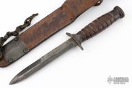 This one has a spear point blade with .189" blade stock and .863" blade depth, hidden tang construction. The handle has a black steel guard and butt with a stacked leather grip. Comes with original brown leather sheath that is stamped "U.S. M6 S.B.L. CO 1943" Has some scratches and patina, otherwise good condition for its age.