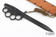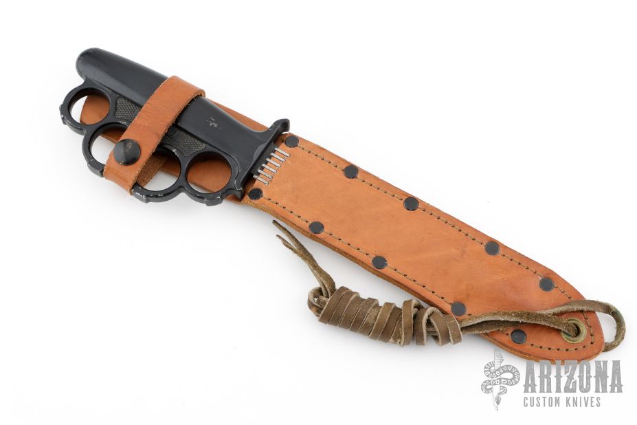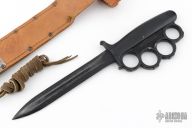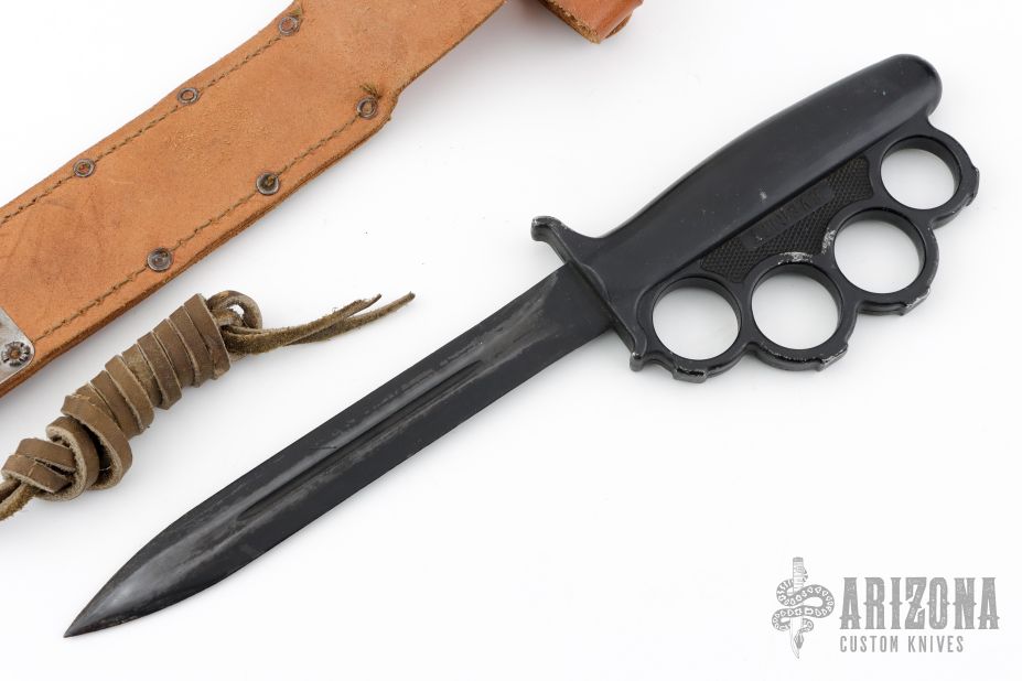Pattern 1 Everitt trench knife in black.  WWII vintage this piece is in very good condition with about 85% paint retention on handle.  Blade has seen very little use and is in very good condition for the age. Original sheath with all rivets, grommets, and snaps in place. Very hard to find!