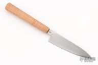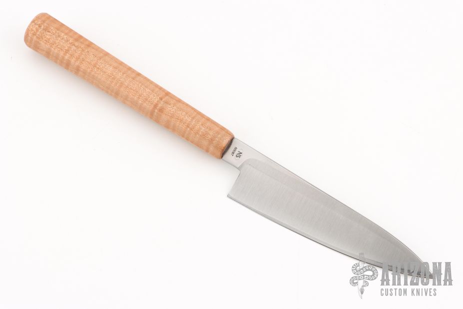 This custom Petty by Nate Summers features a hollow ground satin finish blade with hidden tang construction, .099" Blade Stock and 1.023" Blade Depth. The handle features a curly maple grip.  New from maker!