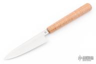 This custom Petty by Nate Summers features a hollow ground satin finish blade with hidden tang construction, .099" Blade Stock and 1.023" Blade Depth. The handle features a curly maple grip. New from maker!