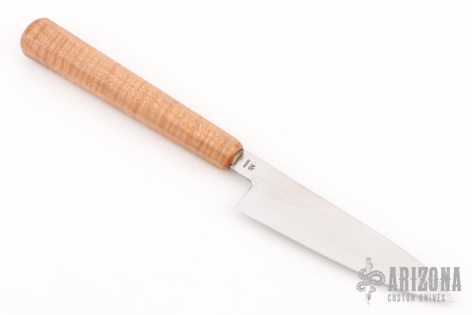 This custom Petty by Nate Summers features a hollow ground satin finish blade with hidden tang construction, .099" Blade Stock and 1.023" Blade Depth. The handle features a curly maple grip.  New from maker!