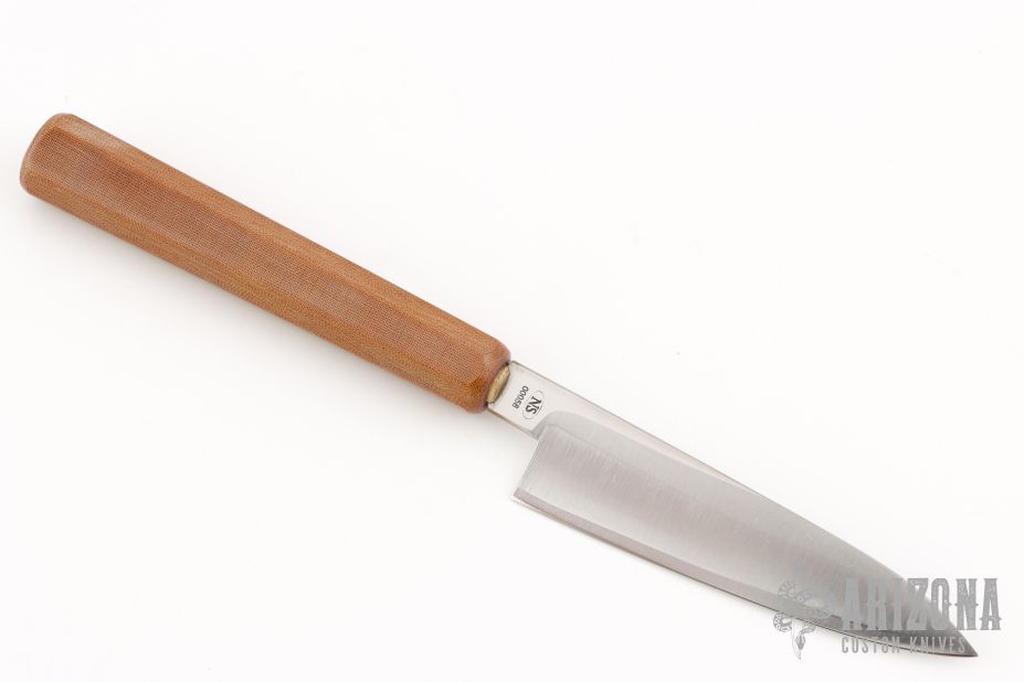 This custom Petty by Nate Summers features a hollow ground satin finish blade with hidden tang construction, .1" Blade Stock and 1.023" Blade Depth. The handle features a micarta grip.  New from maker!