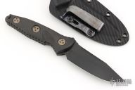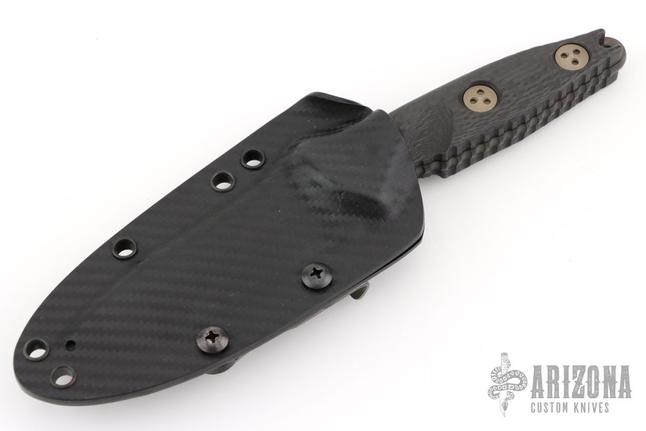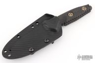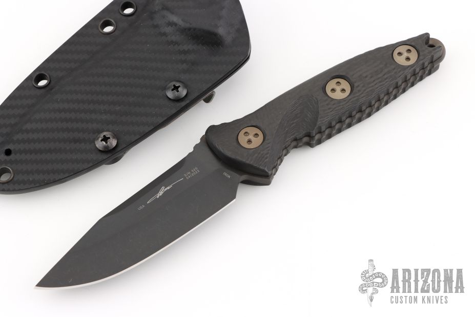 This Mini Socom Alpha by Microtech features a DLC drop point blade, a notched thumb ramp and a full tang construction, .163" Blade Stock. 1.189" Blade Depth. The handle features carbon fiber scales. Includes a kydex sheath with a belt clip. Dated 04/2023.  S/N 520. Comes with original box, sheath, and papers. Excellent condition.