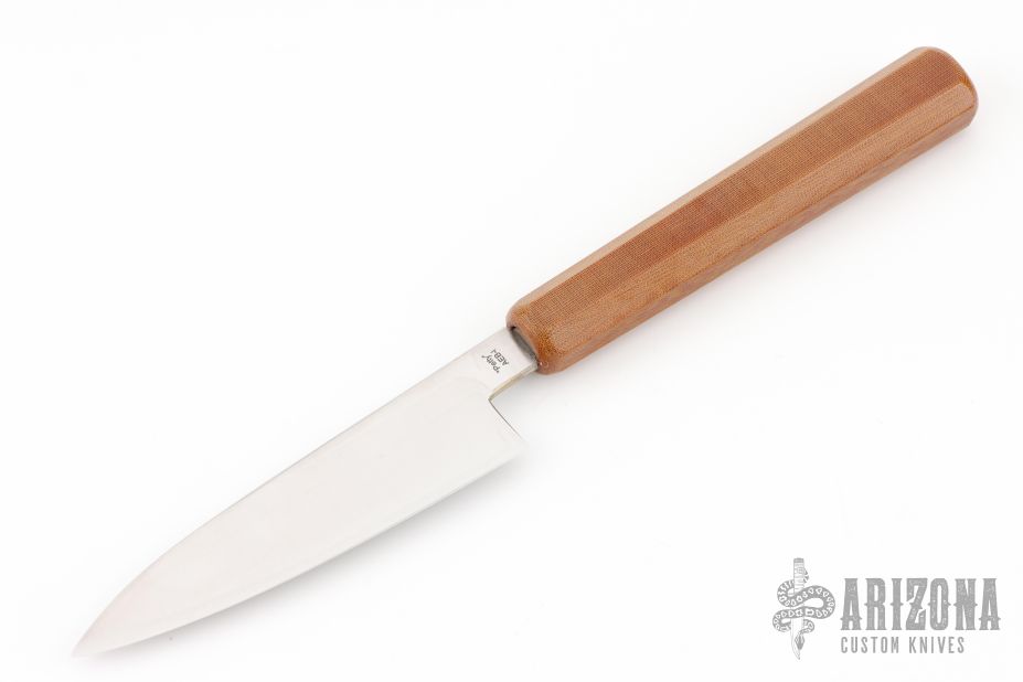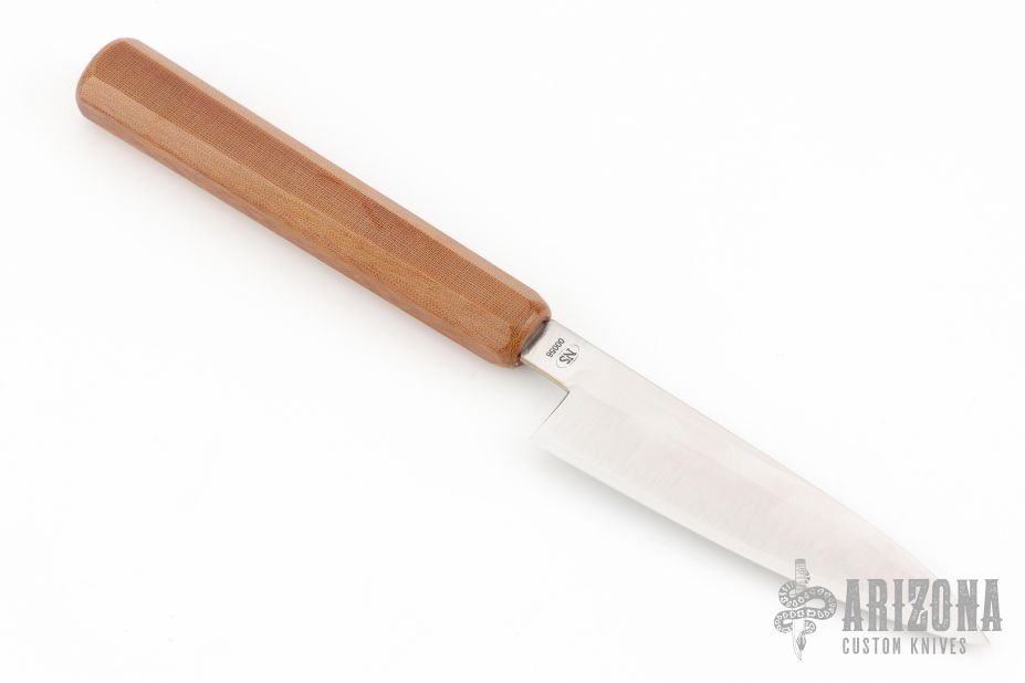 This custom Petty by Nate Summers features a hollow ground satin finish blade with hidden tang construction, .1" Blade Stock and 1.023" Blade Depth. The handle features a micarta grip. New from maker!